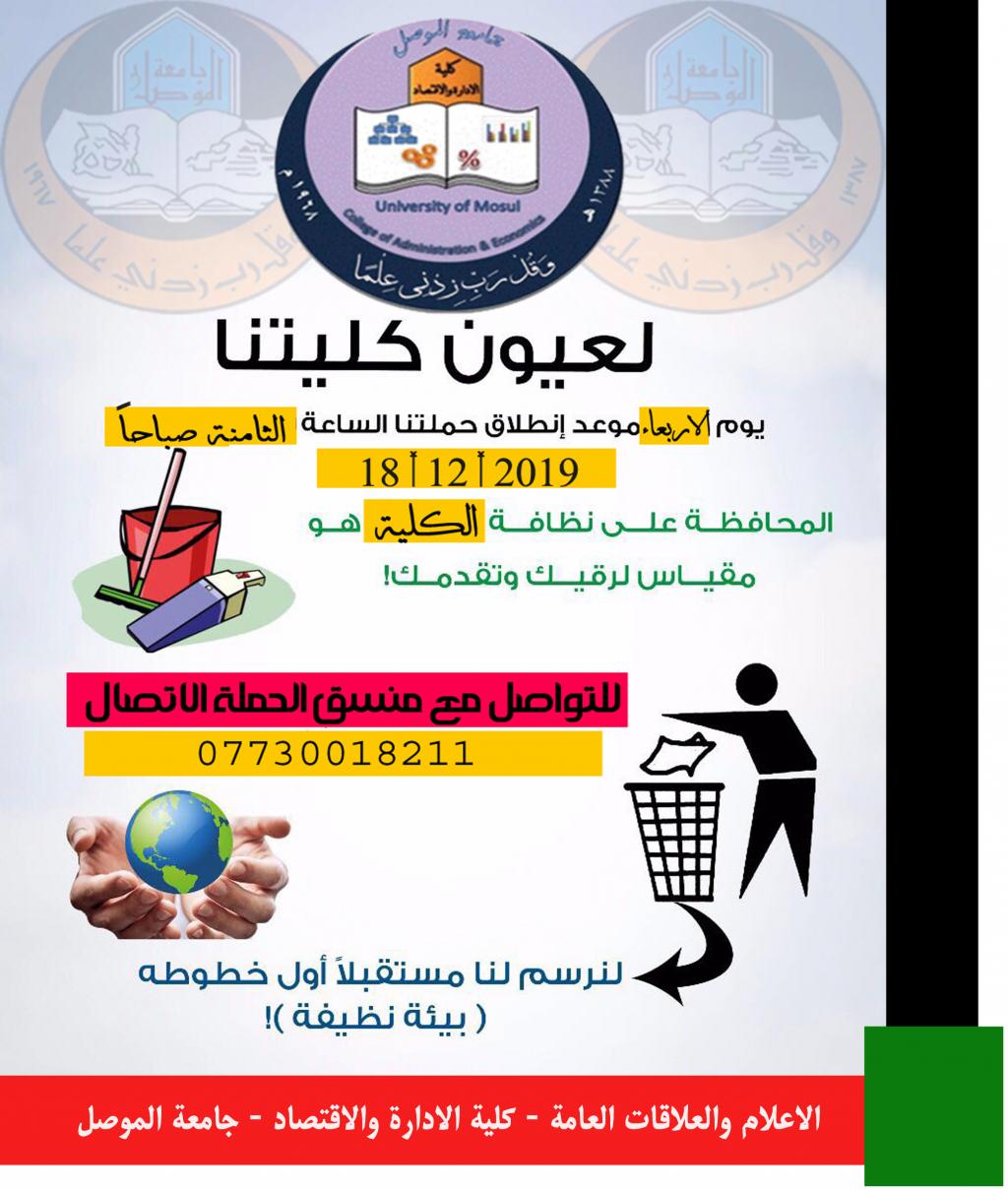 #الاعلانعن#حملة_تنظيف_شاملة_في_جامعة_الموصلالى#طلبةو#منتسبيكلية الادارة والاقتصاد الكرام نود اعلامكم ان هنالك حملة تطوعية شاملة على مستوى جامعة الموصل والتي ستنطلق يوم الاربعاء الموافق 18 – 12 – 2019 وسيكون التجمع في حديقة المركز الطلابي#الساعة#الثامنة#صباحاً.لغرض#التواصلمع#منسق_الحملةالاتصال على الرقم (07730018211)