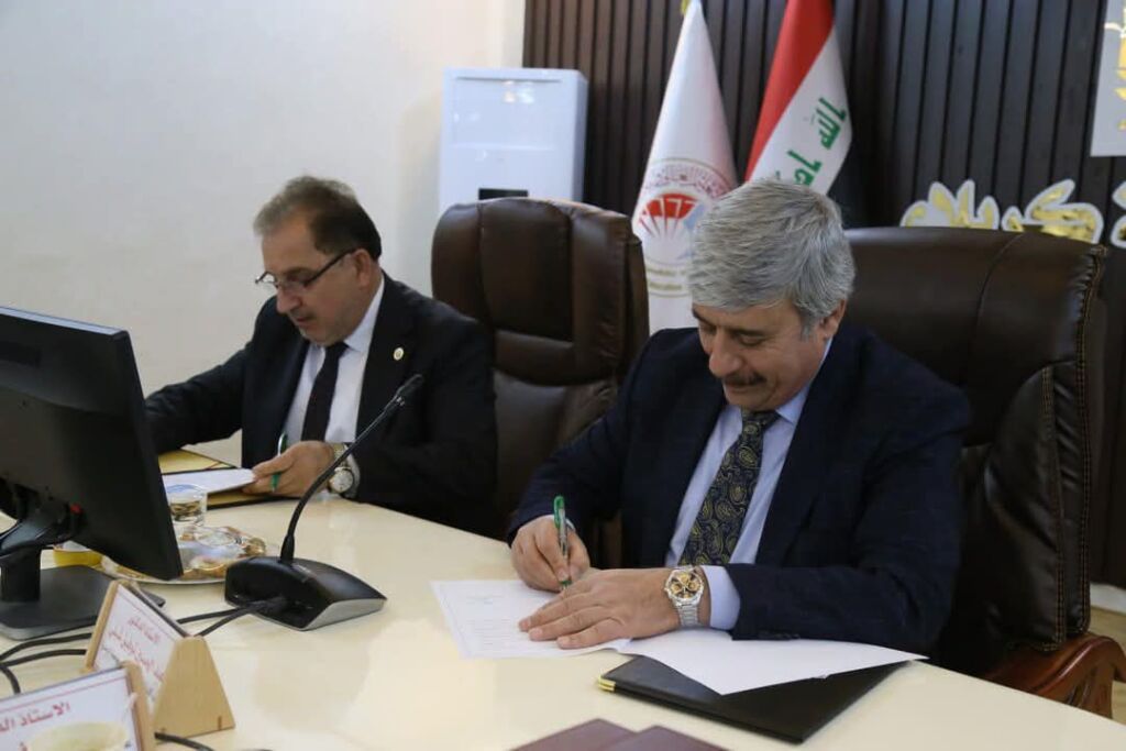 توقيع السيد عميد كلية الادارة والاقتصاد الاستاذ الدكتور ثائر احمد سعدون السمان اتفاقية توأمة مع جامعة المستقبل .