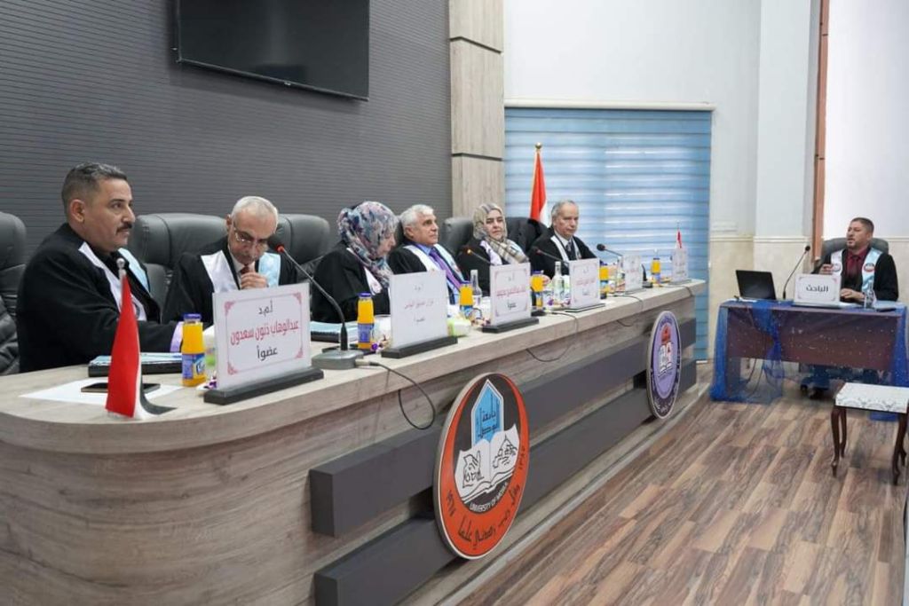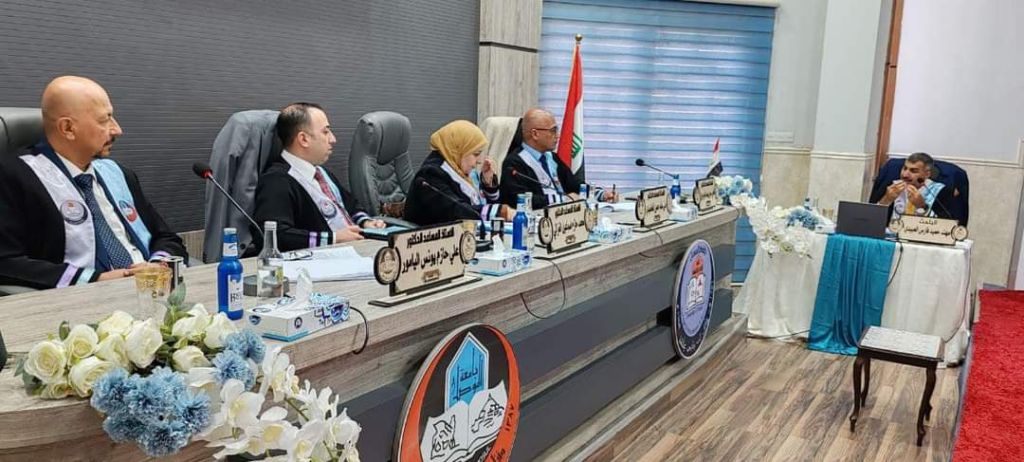 ترأس لجنة المناقشة الأستاذ الدكتورة آلاء حسيب الجليلي , وعضوية كل من الأستاذ المساعد الدكتور عادل محمد عبد الله , و الاستاذ المساعد الدكتور علي عصام لطيف من جامعة المثنى , وبإشراف وعضوية الأستاذ المساعد الدكتور صفوان ياسين حسن .
