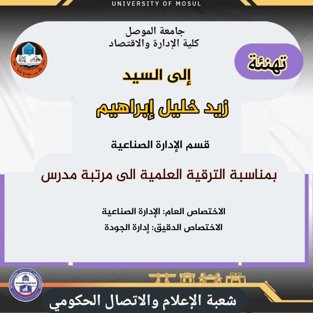 قدّم الأستاذ الدكتور سنان زهير محمد جميل، عميد كلية الإدارة والاقتصاد بجامعة الموصل، يوم الثلاثاء الموافق 14 تشرين الأول 2025، كتاب شكر وتقدير إلى الأستاذ الدكتورة آلاء عبدالواحد ذنون، تقديرًا لفوزها ضمن الفائزين بأربع فئات من جوائز يوم العلم والريادة 2025 على مستوى جامعة الموصل، عن فئة البحث العلمي المتميز، والتي تم تكريمها فيها رسميًا من قبل وزير التعليم العالي والبحث العلمي.
