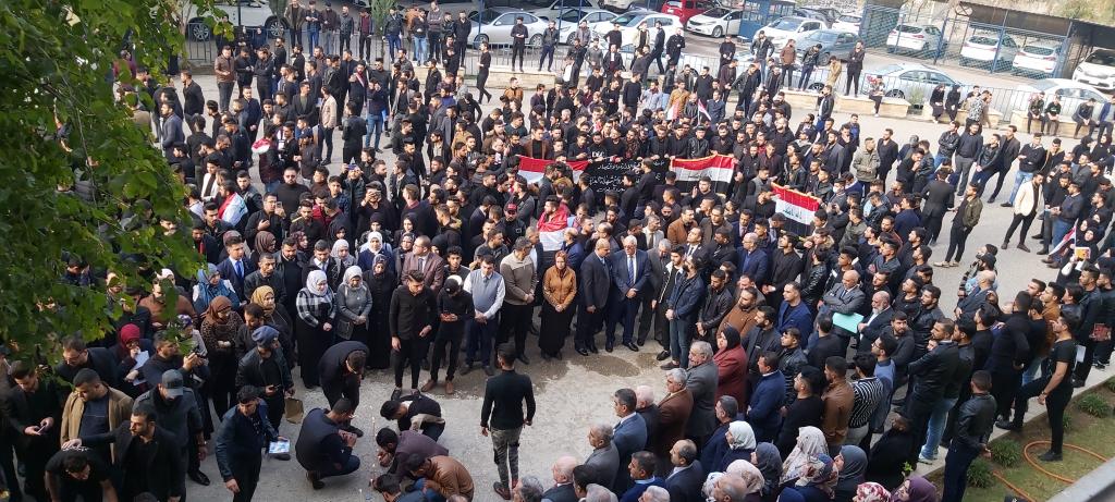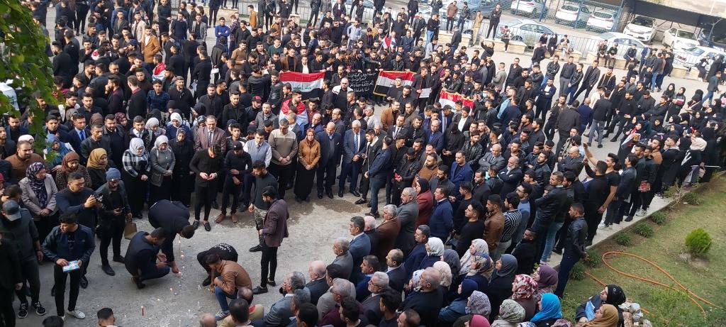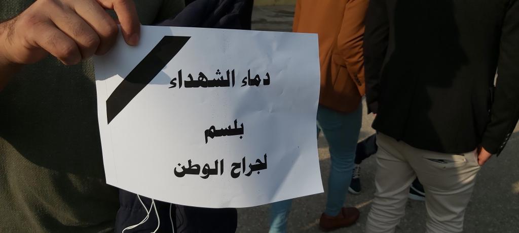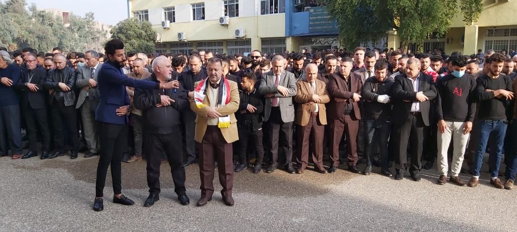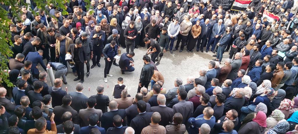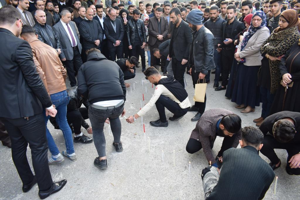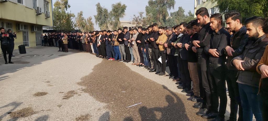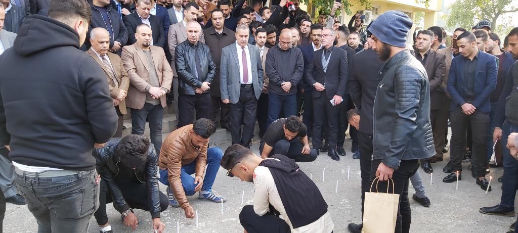 كلية الادارة والاقتصاد تتوشح السواد حزناً وحداداً على ارواح شهداء التظاهرات ممن سقطو في الناصرية والنجف والعراق اجمع حيث نظمت الكلية وقفة حداد بحضور السيد عميد الكلية الاستاذ المساعد الدكتور وحيد محمود رمو والسيد معاون العميد للشؤون الادارية والمالية الدكتور عدنان سالم قاسم والسادة رؤساء الاقسام العلمية واعضاء الهيئة التدريسية وموظفي وطلبة الكلية كافة يوم الاحد الموافق 2019/12/1 وتخلل الوقفة قراءة سورة الفاتحة على ارواح الشهداء والدعاء لهم بالرحمة والخلود وان يعم الامن والامان والسلام في ربوع بلادنا واقيمت صلاة الغائب على ارواح شهدائنا الابرار واُقيدت الشموع استذكاراً على ارواح الشهداء