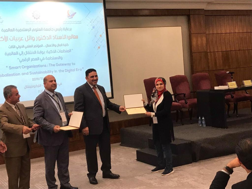 مشاركة تدريسية من قسم المحاسبة في المؤتمر الدولي الذي اقامته جامعة العلوم الاسلامية العالمية / الاردن