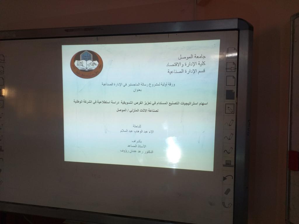 ضمن الانشطة العلمية لقسم الادارة الصناعية ، تم يوم الاثنين الموافق 21/10/2019 مناقشة الورقة الاولية لمشروع رسالة الماجستير في الادارة الصناعية للطالبة ” الاء عبد الوهاب عبد السلام”ومشرفها ا.م.د “رعد عدنان رؤوف ” والتي كان عنوانها ” إسهام استراتجيات التصنيع المستدام في تعزيز الفرص التسويقية “دراسة استطلاعية في الشركة العامة للاثاث المنزلي في الموصل.وقد تكونت لجنة المناقشة للورقة الاولية من السادة التدريسيين:
