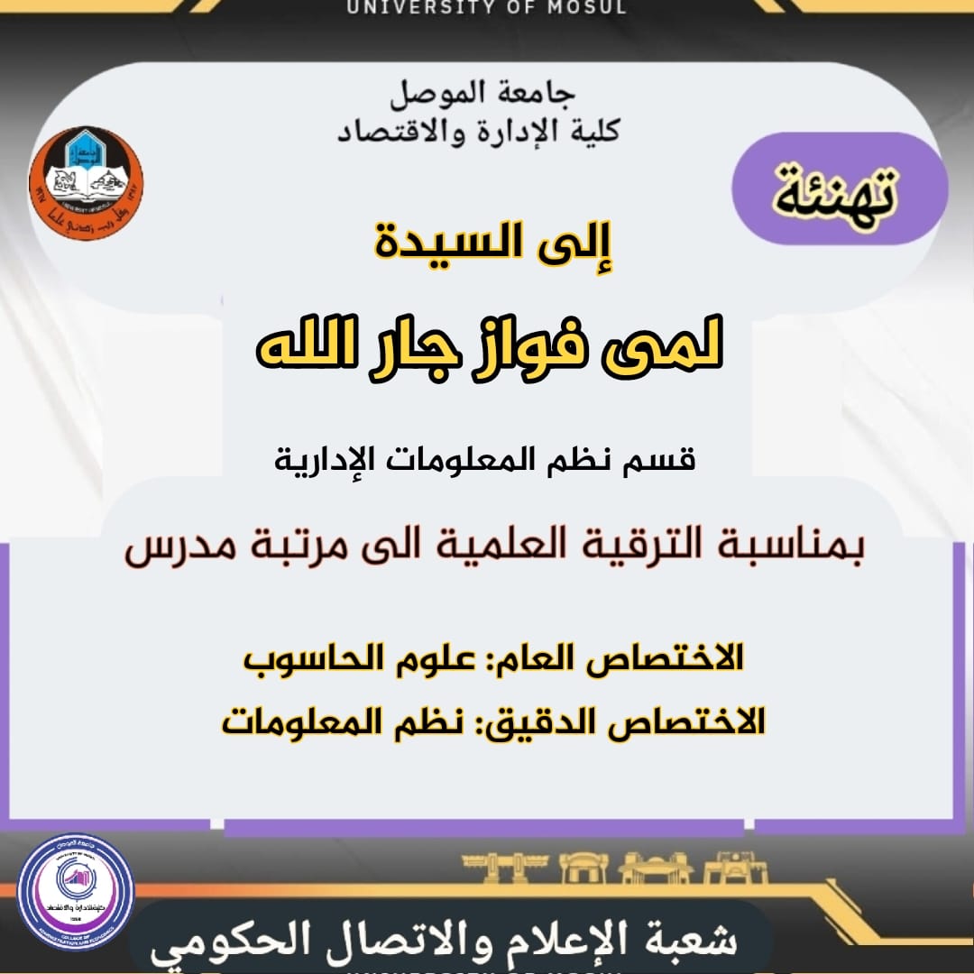 م.د. رغد محمد يحيى عضوا ومشرفاواوصت اللجنة بمنحها شهادة الدبلوم العالي في ادارة الاعمال بعد اجراء التعديلات اللازمة واكمال متطلبات منح الشهادة” مع تمنياتنا للطالبة بالموفقية والنجاح “الاعلام