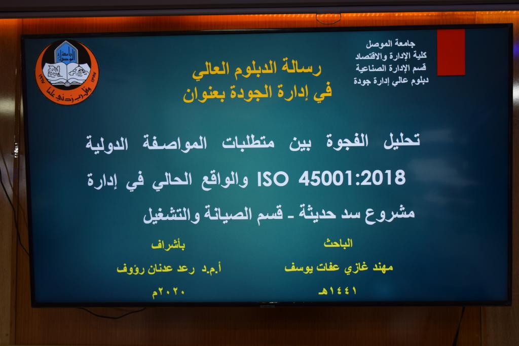بحث #الدبلوم العالي التخصصي في ادارة الجودة قسم #الإدارة_الصناعية #كلية_الإدارة_والاقتصاد – #جامعة_الموصل #يناقش ” تحليل الفجوة بين متطلبات المواصفة الدولية 2018:45001 ISO والواقع الحالي في ادارة مشروع سد حديثة / قسم الصيانة والتشغيل ” #سعى البحث الذي تقدم به #الباحث مهند غازي عفات ” إلى التعرّف على مفهوم نظام إدارة الصحة والسلامة المهنية وواجباتها ومهامها وأهدافها وكذلك التعريف بمخاطر وإصابات العمل. كما تم التعرّف على واقع الصحة والسلامة المهنية في إدارة مشروع سد حديثة, إذ تم تقديم مقترحات من شأنها أن تساعد في المعالجة وتقليل الفجوة بين الواقع الفعلي للجهة المبحوثة ومتطلبات المواصفة الدولية 45001:2018 ISO تم جمع المعلومات التي ساعدت الباحث من خلال المقابلات التي أجراها مع المدير ومعاونه ورؤساء الأقسام الفنية والمهندسين والعاملين في مجال الصحة والسلامة المهنية فضلاً عن العاملين التي تكون بيئة عملهم معرضة إلى المخاطر بصورة مباشرة في إدارة مشروع سد حديثة وكما مبين في الملحق رقم (1), وبقصد الوصول إلى الحقائق العلمية اعتمد منهج دراسة الحالة الذي يتضمن الملاحظة والمعايشة الميدانية واللقاءات المباشرة. وتم استخدام قائمة الفحص (Checklist) المعتمدة في الدراسة على ضوء متطلبات المواصفة الدولية لنظام إدارة الصحة والسلامة المهنية ISO 45001:2018 الرئيسة والفرعية منها الصادرة من المنظمة الدولية للمعايير (ISO). وأما وسائل التحليل الإحصائي فقد استخدم الوسط الحسابي المرجح والنسبة المئوية للتطبيق والتوثيق للتعبير عن مدى الاختلاف والتطابق مع متطلبات المواصفة .فيما اعتمد المقياس السباعي وفق مقياس ليكرت(Likert Scale) لهذه القائمة إذ أنّ أقل وزن (0) وأعلى وزن (6). أظهرت نتائج الدراسة وجود فجوات كبيرة بين الواقع الفعلي ومتطلبات نظام إدارة الصحة والسلامة المهنية وفق المواصفة ISO 45001:2018 إذ إن النسبة المئوية الإجــمالية للتطبيق والتوثيق في إدارة مشروع سد حديثة لمتطلبات المواصفة بلغت (29)% مقارنة بالتطبيق القياسي لهذه المتطلبات، مما يعكس ابتعاداً إجمالياً كبيراً عن متطلبات المواصفة بنسبة (71)% نتيجة للفجوات التي ظهرت في نتائج تقييم تطبيق المتطلبات في المشروع، وقد اقترحت الدراسة على إدارة مشروع سد حديثة بضرورة اعتماد المواصفة الدولية لنظام إدارة الصحة والسلامة المهنية ISO 45001:2018. كذلك اقترحت الدراسة بضرورة قيام المنظمات الرقابية الخارجية المتمثلة في المركز الوطني للصحة والسلامة المهنية ومديرية الدفاع المدني العامة/ قسم الوقاية والسلامة الصناعية بممارسة أعمالها الرقابية وتلتزم بتحديد فترات كافية وملائمة للقيام بعمليات التفتيش، وذلك للتأكد من تطبيق الأنظمة واللوائح والقوانين الخاصة بالصحة والسلامة المهنية، وبالتالي المحافظة على أرواح العاملين والمترددين على المنظمات، والحفاظ على الممتلكات من المعدات والمكائن من التلف. وتشجيع العاملين على الصحة والسلامة المهنية للتعرّف بشكل كامل على المواصفة ISO 45001:2018 من أجل تطويرهم ورفع مستوى معلوماتهم حتى يتمكنوا من مواكبة الدول المتقدمة في العالم للسيطرة على الصحة والسلامة المهنية بأفضل السبل وأقل التكاليف للحفاظ على سلامة العاملين والممتلكات في مجال عملها, والتأكيد على ضرورة وضع إرشادات واضحة ومفهومه لكافة العاملين تتضمن توضيحات ومخططات وأشكال للتنبيه على مدى شدة المخاطر المحيطة بهم في موقع العمل وكذلك السبل التي يجب اتخاذها لتجنب الوقوع في الخطر واحتمالات الإصابة.#تمت المناقشة بحضور السيد عميد كلية الادارة والاقتصاد الاستاذ الدكتور ثائر احمد سعدون السمان والسيد معاون العميد للشؤون الادارية الدكتور #احمد حسين الجرجري على قاعة المناقشات مبنى عمادة الكلية يوم الخميس الموافق 28_1_2021 الساعة التاسعة صباحاً .#لجنة المناقشة برئاسة أ.م. #رياض جميل وهاب /جامعة الموصل- كلية الادارة والاقتصاد وعضوية م.د #يونس احمد خليل /جامعة الموصل- كلية الادارة والاقتصاد واشراف أ.