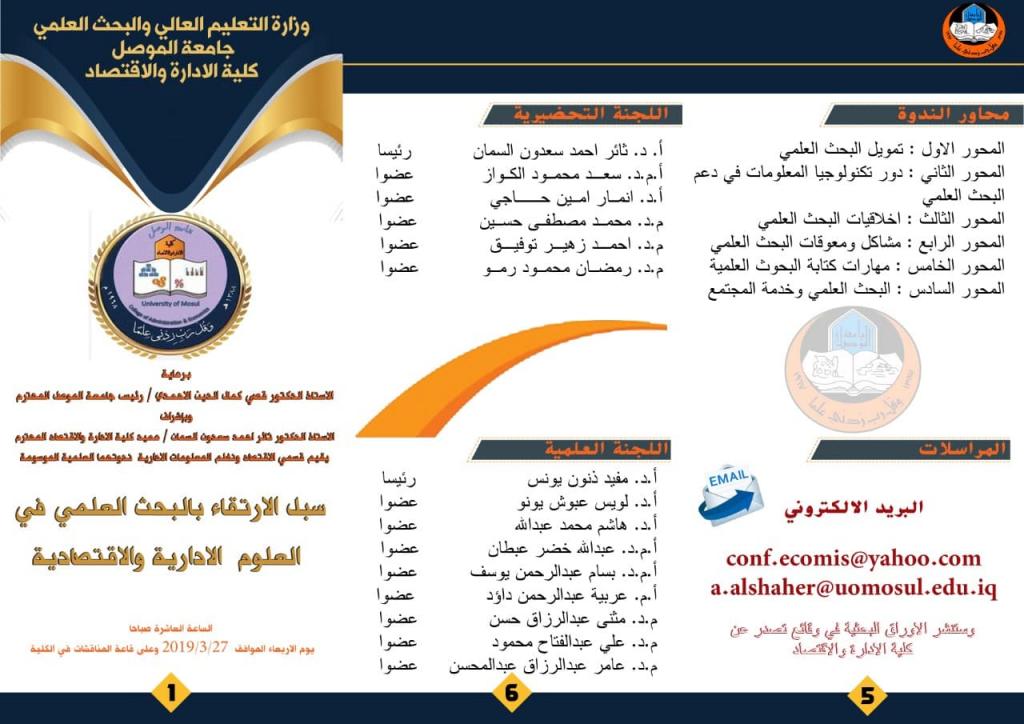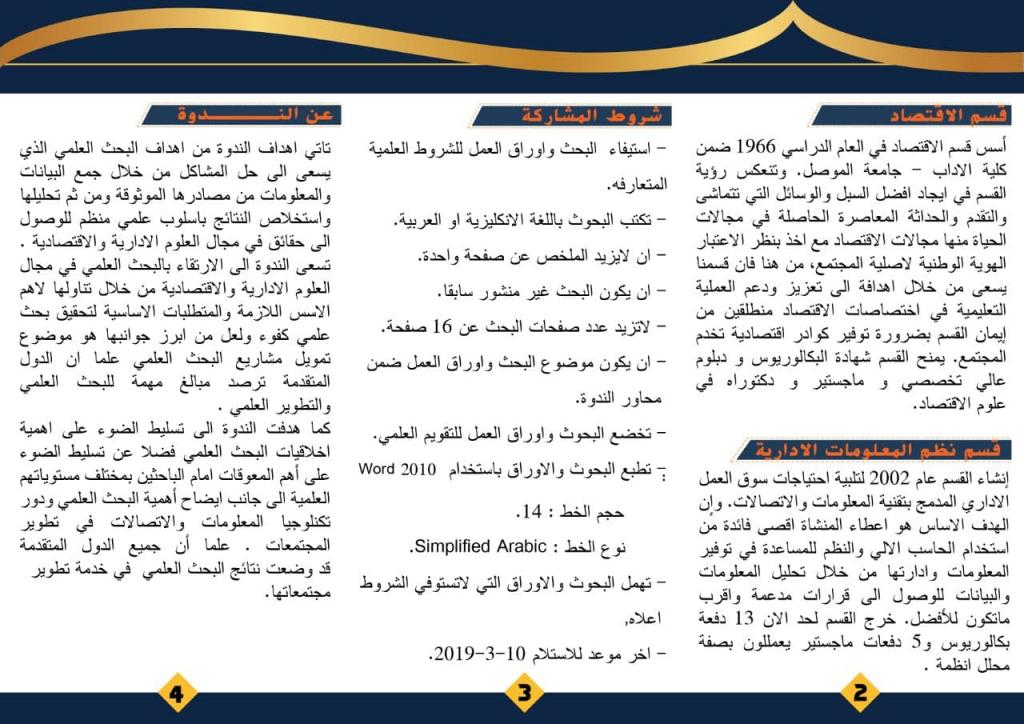 برعاية السيد رئيس جامعة الموصل الاستاذ الدكتور قصي كمال الدين الاحمدي والسيد عميد كلية الادارة والاقتصاد الاستاذ الدكتور ثائر احمد سعدون السمان يقيم قسم الاقتصاد بالتعاون مع قسم نظم المعلومات الادارية ندوتهما العلمية والموسومة(سبل الارتقاء بالبحث العلمي في العلوم الادارية والاقتصادية) وذلك في يوم الاربعاء الموافق ٢٧_٣_٢٠١٩