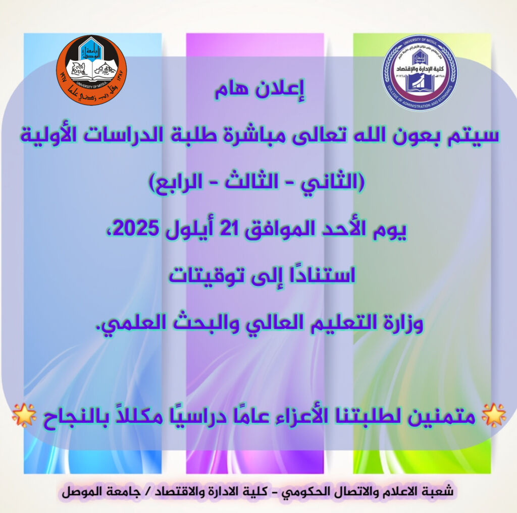 بإشراف السيد عميد كلية الإدارة والاقتصاد – جامعة الموصل، الأستاذ الدكتور سنان زهير محمد جميل، نظّمت وحدة الشؤون العلمية بالتعاون مع قسم الإدارة الصناعية، يوم الأحد الموافق 21 أيلول 2025 عند الساعة 12:30 ظهرًا في قاعة رقم (1)، ورشة علمية بعنوان: