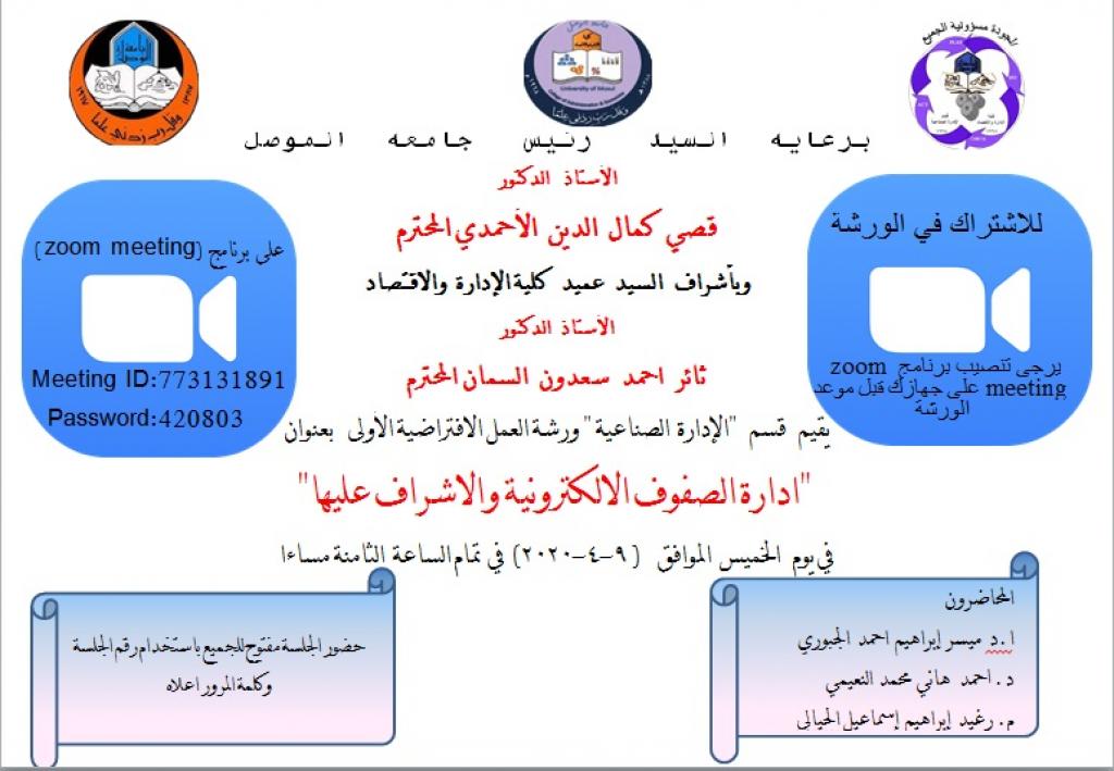 برعاية السيد رئيس جامعة الموصل ” الاستاذ الدكتور ” قصي كمال الدين الاحمدي المحترم ،وباشراف السيد عميد كلية الادارة والاقتصاد ” الاستاذ الدكتور ” ثائر احمد سعدون السمان ،يقيم قسم الادارة الصناعية ” ورشة العمل الافتراضية الاولى بعنوان ” ادارة الصفوف الالكترونية والاشراف عليها ” في يوم الخميس الموافق 2020-4-9 في تمام الساعة الثامنة مساءا