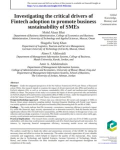 “التحقيق في المحركات الحرجة لتبنّي التكنولوجيا المالية لتعزيز استدامة الأعمال للمؤسسات الصغيرة والمتوسطة”.
