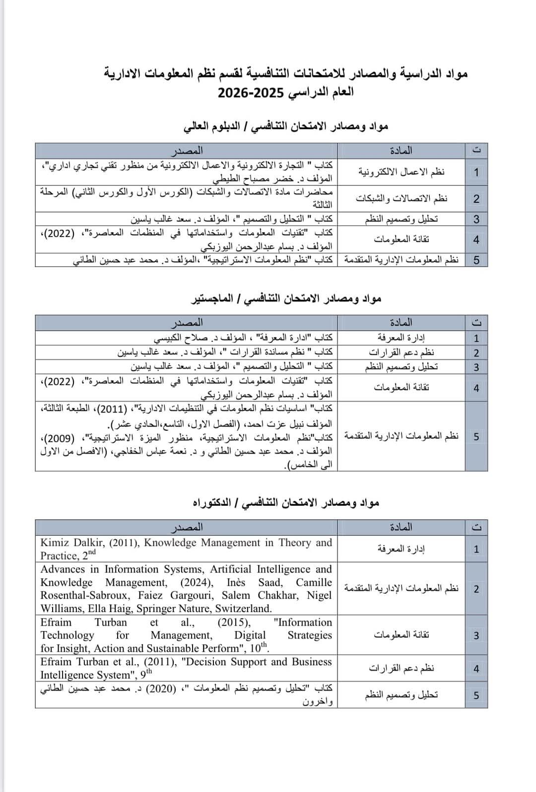 مواد الدراسية والمصادر للامتحانات التنافسية لقسم نظم المعلومات الادارية العام الدراسي 2025-2026