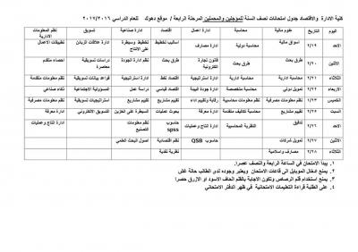 تعلن عمادة كلية الإدارة والإقتصاد عن جدول إمتحانات المرحلة الاولى (نظام النصف السنوي – الدور الاول) والجدول الإمتحاني للطلبة (المؤجلين والمحملين – النظام السنوي ) والجدول الإمتحاني لطلبة المرحلة الثالثة والرابعة (المؤجلين والمحملين) الذين يتبعون النظام السنوي.. بالإضافة إلى جدول المرحلة الأولى الذين يتبعون نظام النصف السنوي (الكورسات)، علما ان المحملين بالمواد الدراسية للمرحلة الاولى وهم الآن في المرحلة الثانية سيؤدون إمتحاناتهم وفق جدول المرحلة الأولى.. مع تمنياتنا لكم بالموفقية والنجاح.