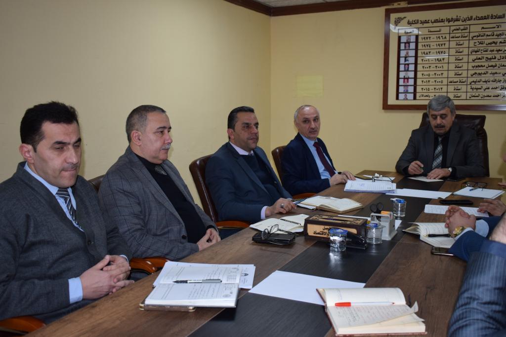 ترأس السيد عميد الكلية الاستاذ الدكتور ثائر احمد سعدون السمان مجلس كلية الادارة والاقتصاد يوم الاحد الموافق 2020/2/23 على قاعة الاجتماعات في مجلس الكلية بحضور السيد معاون العميد للشؤون العلمية الاستاذ المساعد الدكتور وحيد محمود رمو والسيد معاون العميد للشؤون الادارية والمالية الاستاذ المساعد الدكتور عدنان سالم قاسم والسادة رؤساء الاقسام العلمية لمناقشة آمور تخص الكلية والتباحث حول حالات طلبة الدراسات الاولية والدراسات العليا