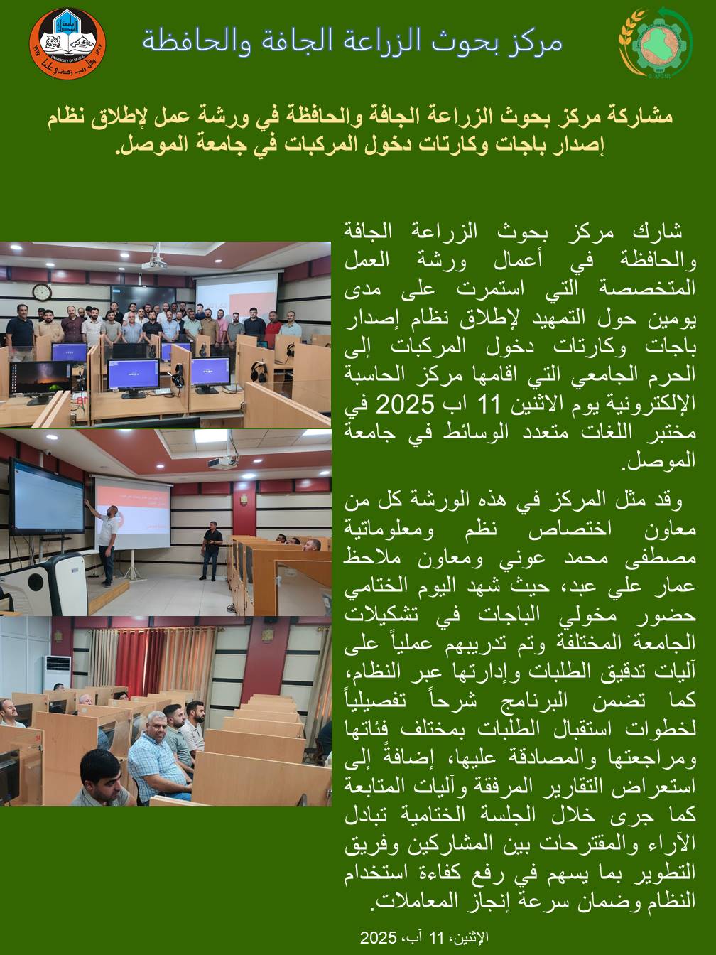 مشاركة مركز بحوث الزراعة الجافة والحافظة في ورشة عمل لإطلاق نظام إصدار باجات وكارتات دخول المركبات في جامعة الموصل.