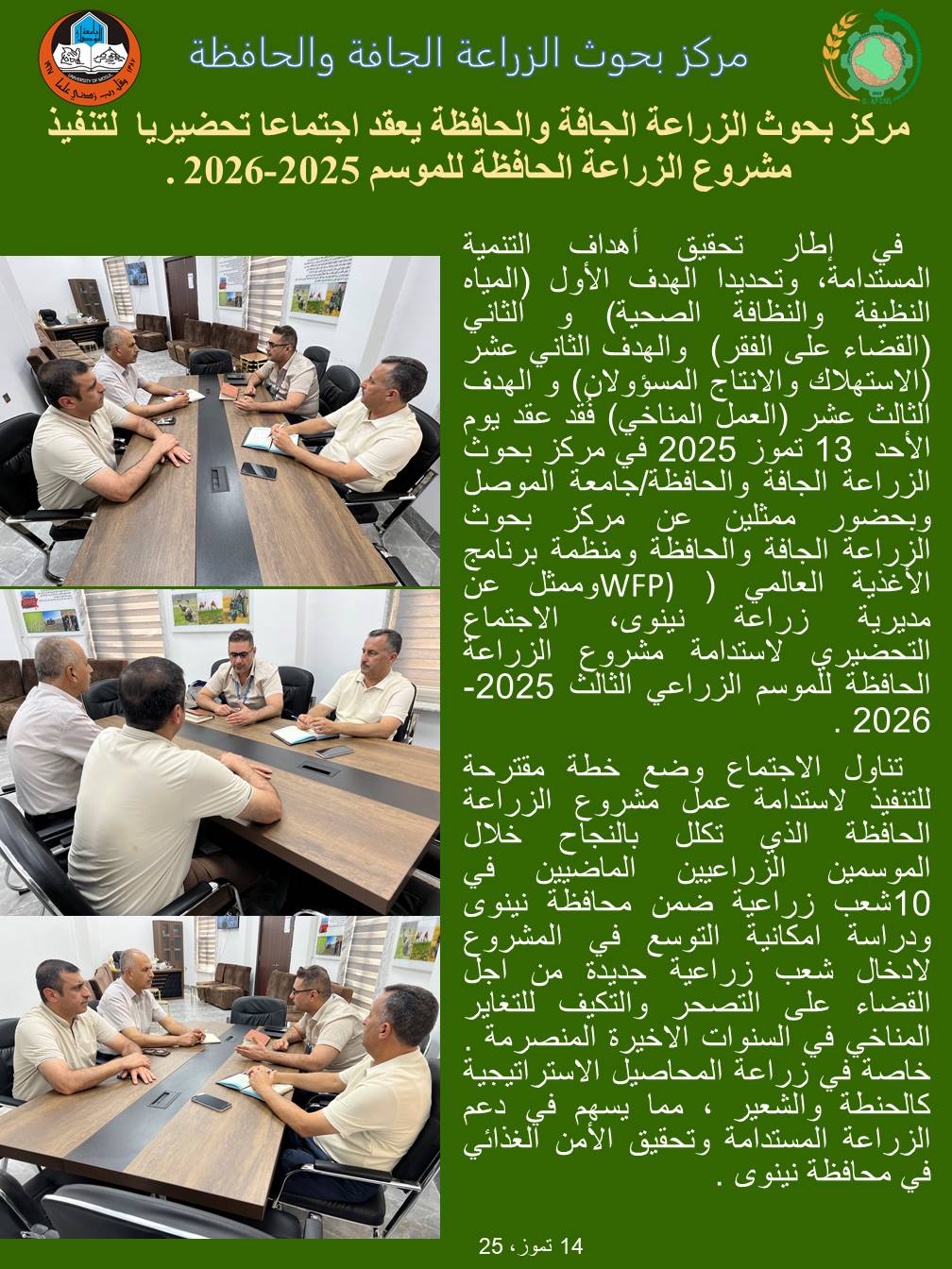 مركز بحوث الزراعة الجافة والحافظة يعقد اجتماعاً تحضيرياً لتنفيذ مشروع الزراعة الحافظة للموسم 2025-2026 .