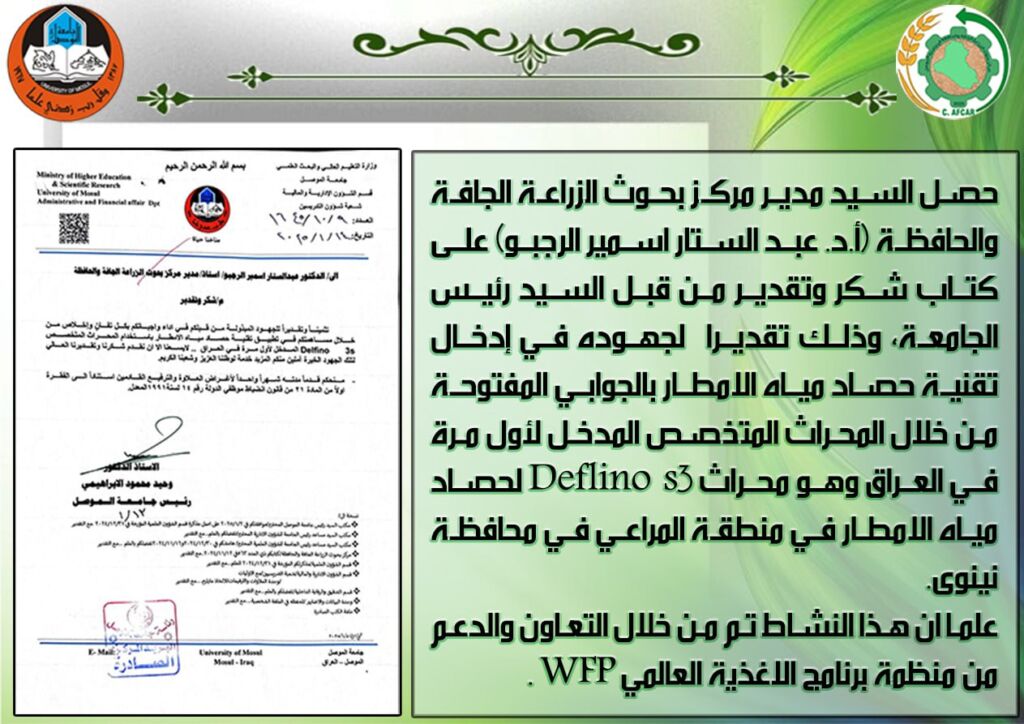 في تاريخ ٢ فبراير ٢٠٢٥، قام مركز الزراعة الجافة والحافظة جامعة الموصل بتنظيم ندوة إرشادية تعريفية في ناحية المحلبية حول تقنية الزراعة الحافظة وبالتعاون مع مديرية زراعة نينوى و منظمة برنامج الاغذية العالمي WFP .