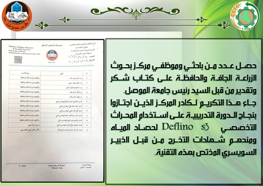 شكر وتقدير من السيد رئيس جامعة الموصل المحترم ال السيد مدير مركز بحوث الزراعة الفة والحافظة المحترم نظرا لجهوده المبذوتقنيات حصاد المياه.