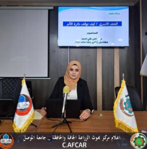 برعاية الاستاذ الدكتور وحيد محمود الابراهيمي رئيس جامعة الموصل وبإشراف الاستاذ الدكتور عبدالستار اسمير الرجبو مدير مركز بحوث الزراعة الجافة والحافظة وتنفيذا للخطة الوطنية الثالثة للمرأة والأمن والسلام _ركيزة (الحماية والوقاية ) ، اقامت  لجنة شوؤن المرأة في مركز بحوث الزراعة الجافة والحافظة ورشة عمل بعنوان (العنف الاسري/كيف نوقف دائرة الألم ) من اعداد المدرس عباس علي احمد و م.مهندس زراعي رشا حامد عواد ، يوم الخميس ٢٧ شباط ٢٠٢٥ ، تناولت هذه الورشة الأسباب والتداعيات والحلول للحد من العنف الاسري .