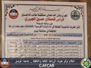 شارك يوم الاربعاء ٩ نيسان ٢٠٢٥ كلاً من الدكتور عدنان عبد احمد مسؤول الشؤون العلمية في المركز بصفته عضواً ومشرفاً مشاركا على الرسالة ، فضلا عن مشاركة الدكتور محمود عواد حسين رئيس قسم التقنيات الميكنية في المركز بصفة عضو لجنة مناقشة طالب الماجستير (فراس قحطان حسين) من كلية الزراعة والغابات / قسم المكائن والآلات الزراعية وذلك عن رسالته الموسومة ( تأثير الظروف التشغيلية المختلفة في اداء الباذرة القرصية “skalak”تحت نظام الزراعة الحافظة في محافظة نينوى).