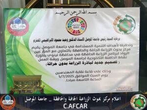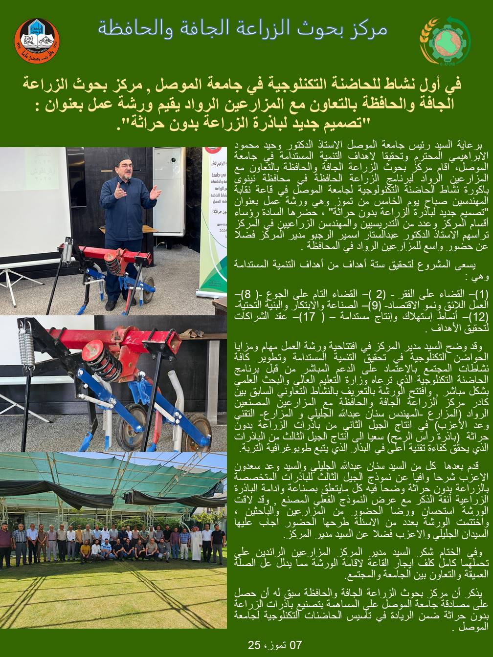 في أول نشاط للحاضنة التكنلوجية في جامعة الموصل , مركز بحوث الزراعة الجافة والحافظة بالتعاون مع المزارعين الرواد يقيم ورشة عمل بعنوان “تصميم جديد لباذرة الزراعة بدون حراثة”.