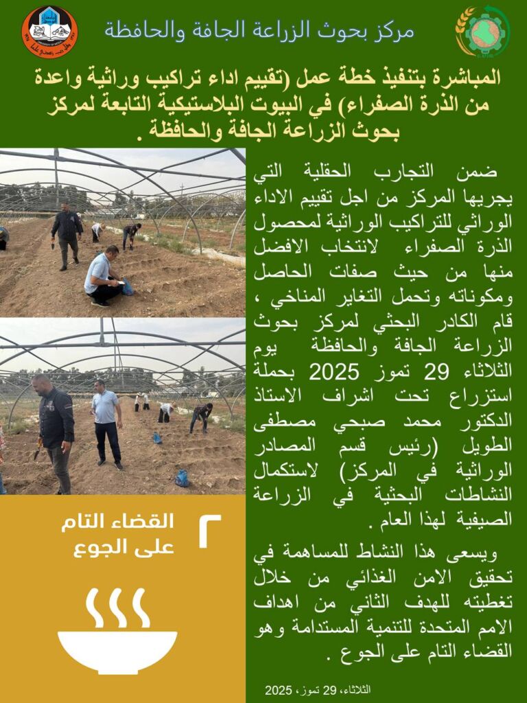 المباشرة بتنفيذ خطة عمل (تقييم اداء تراكيب وراثية واعدة من الذرة الصفراء) في البيوت البلاستيكية التابعة لمركز بحوث الزراعة الجافة والحافظة .