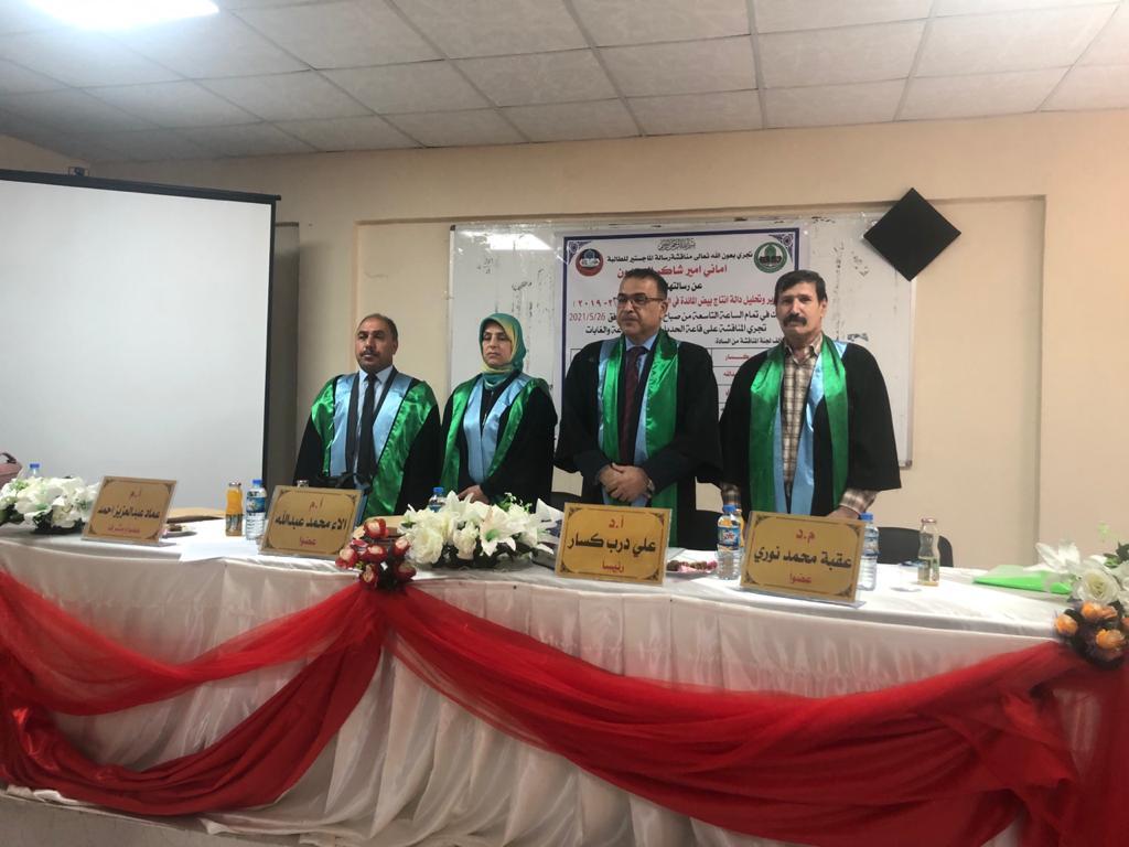 نوقشت صباح اليوم رسالة ماجستير في قسم الاقتصاد الزراعي تقدمت بها الطالبة اماني أمير شاكر والموسومة (تقدير وتحليل دالة انتاج بيض المائدة في العراق للمدة 2000-2019) حضر جانب منها معاوني العميد للشؤون العلمية والإدارية. وقد ترأس لجنة المناقشة الأستاذ الدكتور علي درب كسار وعضوية الدكتورة الاء محمد عبد الله والدكتور عقبة محمد نوري الدكتور عماد عبد العزيز احمد مشرفاً.