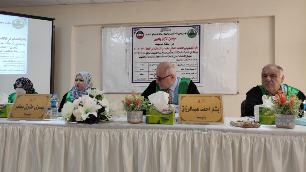 هذا وترأس لجنة المناقشة الأستاذ الدكتور بشار أحمد عبد الرزاق وعضوية الدكتورة يسرى طارق بكر والأستاذ الدكتور قيس ناظم غزال وبإشراف الدكتورة ايمان يونس محمود
