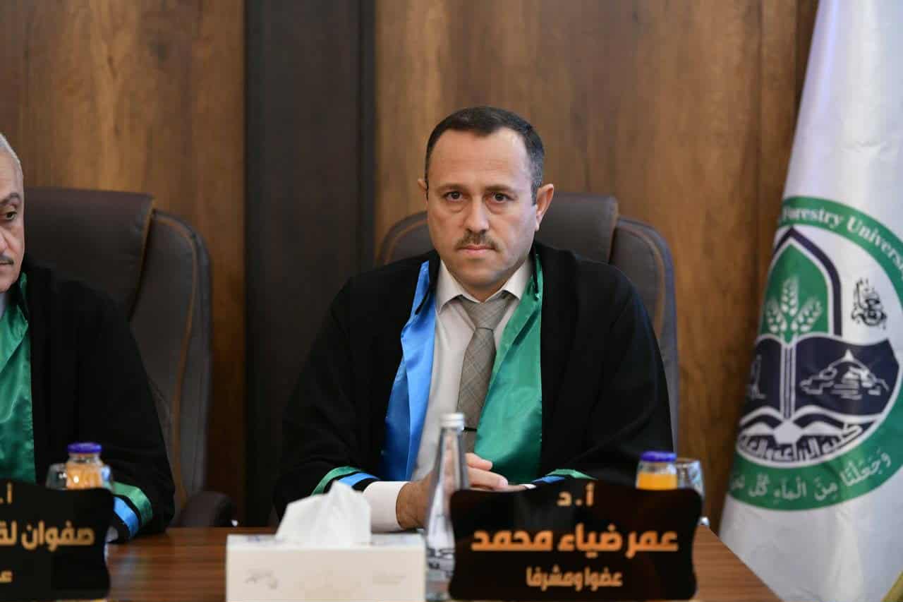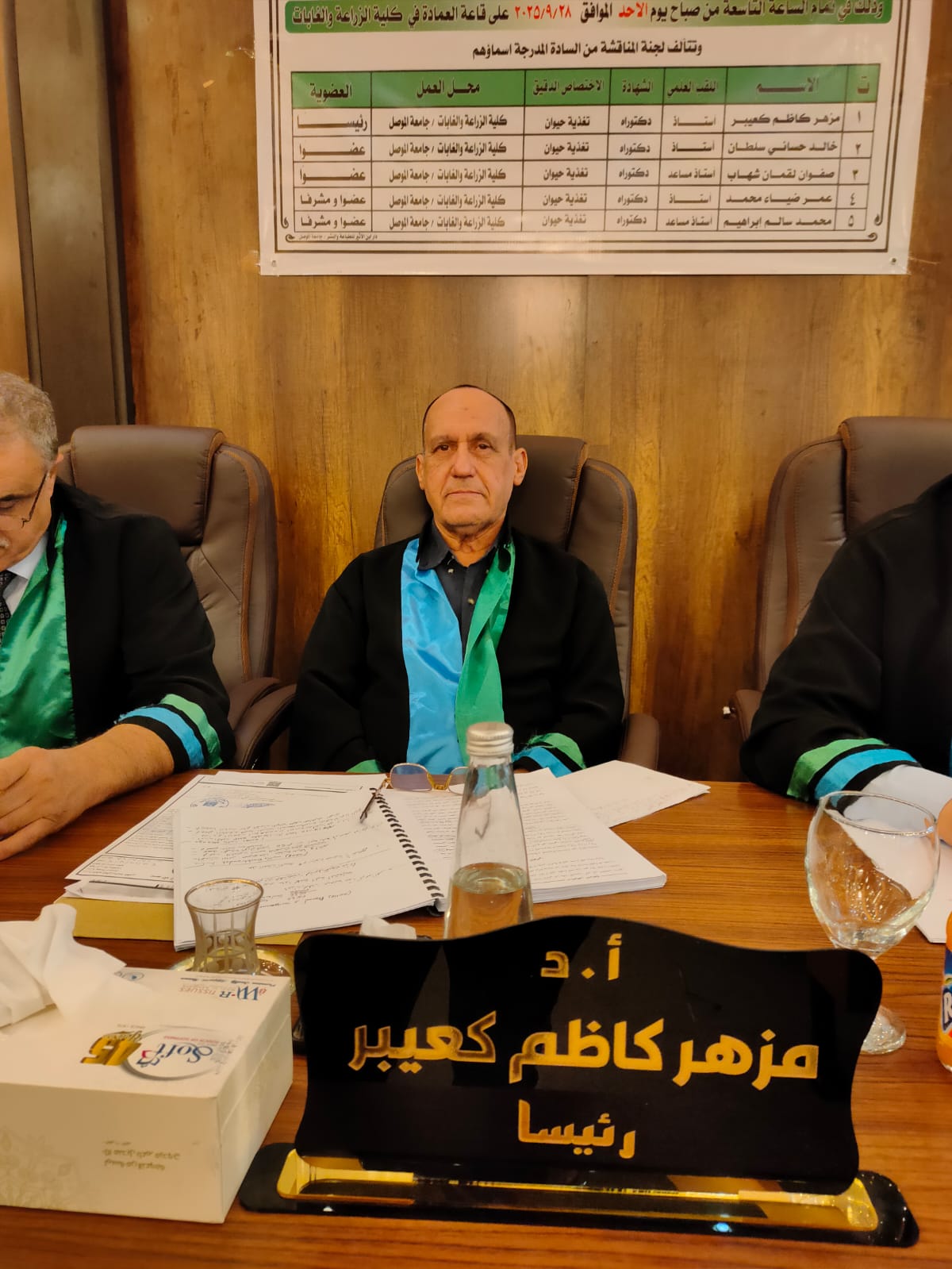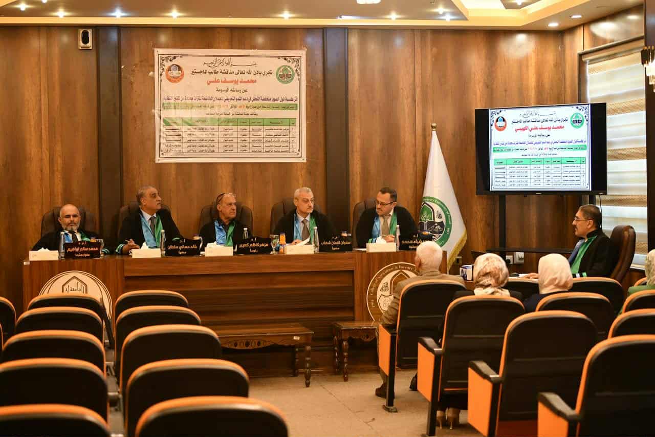 وقد ترأس لجنة المناقشة الاستاذ الدكتور مزهر كاظم كعيبر وعضوية كل من الاستاذ الدكتور خالد حساني سلطان والأستاذ المساعد الدكتور صفوان لقمان شهاب وبإشراف كل من الأستاذ الدكتور عمر ضياء الملاح والأستاذ المساعد الدكتور محمد سالم ابراهيم.