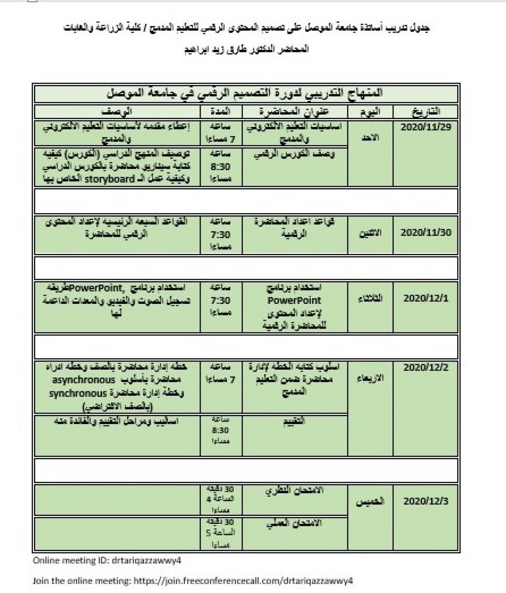 ضمن استعدادات رئاسة جامعة الموصل لبدء العام الدراسي ٢٠٢٠_٢٠٢١ ، وحرصا منها وعمادة كلية الزراعة والغابات على تدريب الكوادر التدريسية على تصميم المحتوى الرقمي للوحدات التعليمية ، اقامت كليتنا دورة اعداد وتصميم المحتوى الرقمي للمدة من ٢٩/١١_٢/١٢ ، وتضمنت الدورة التي قدمها الدكتور طارق زيد ابراهيم عبر الفضاء الاليكتروني باستخدام برنامج Free Conference Call اهم مرتكزات و قواعد تصميم المحتوى الرقمي للمحاضرات واعقب مقرر الدورة ورشة عمل تطبيقية في يوم الخميس ٣/١٢ تناول فيها بعض الامثلة التطبيقية لاعداد المحتوى الرقمي للمحاضرات
