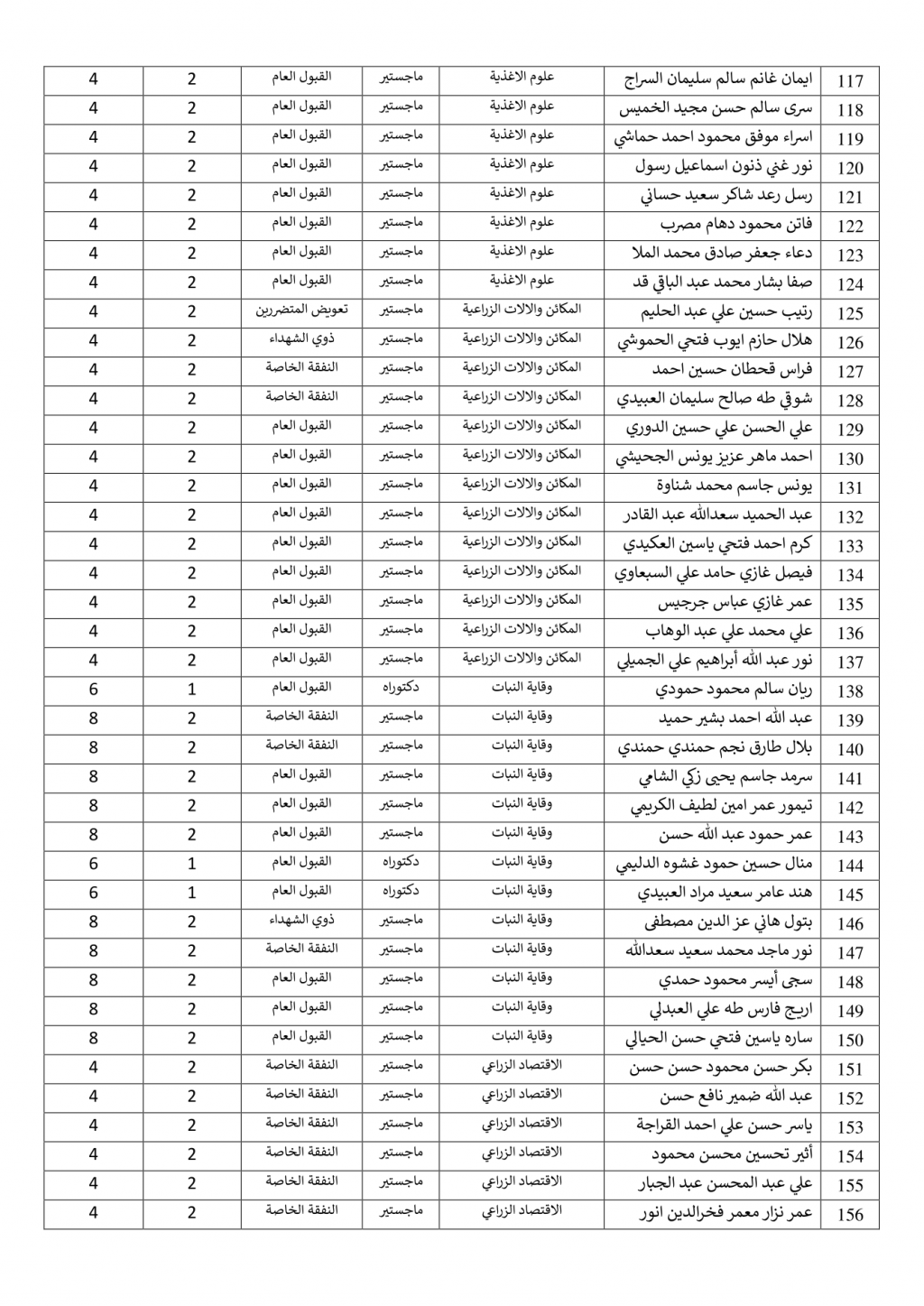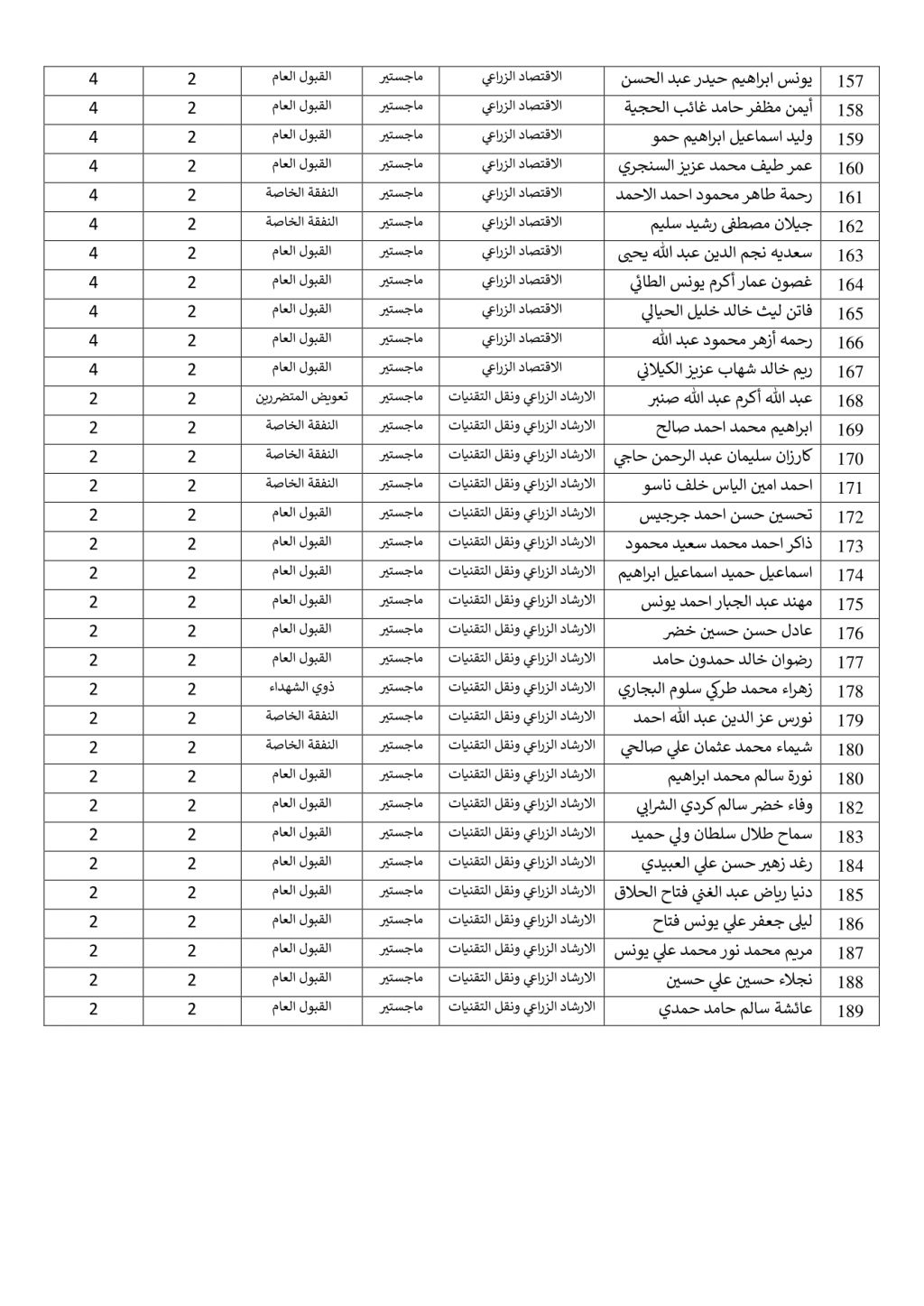 - معدل القبول في كلية الزراعة للدراسة المسائية 60%. ويخول مجلس الجامعة ايضاً بتخفيض الحدود الدنيا لمعدل القبول بما لا يزيد عن 3 درجات حسب حاجة المحافظة والجامعة وفقاً لمبدأ استقلالية الجامعات.
