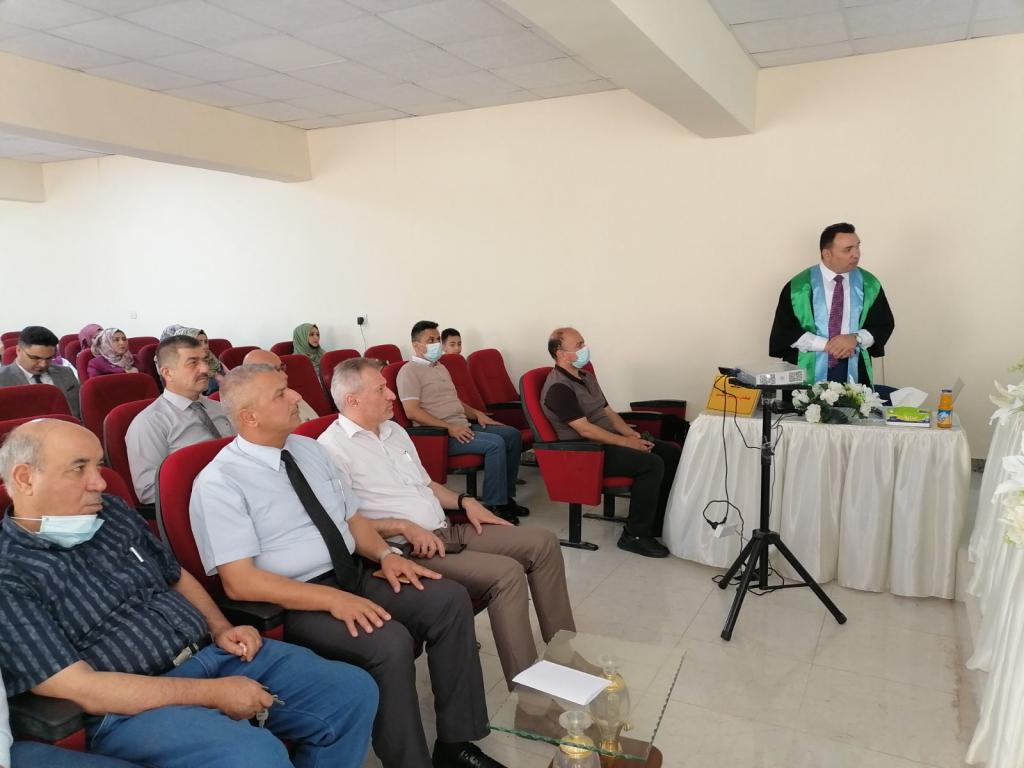 وترأس لجنة المناقشة الأستاذ الدكتور محمد علي جمال وعضوية الأستاذ الدكتور اكرم عثمان نايف والأستاذ الدكتور معاذ عبدالله نجم الحجار والأستاذ المساعد الدكتور مجبل محمد عبيد و الأستاذ المساعد الدكتور عبدالقادر عبش سباك والأستاذ المساعد الدكتور حازم محمود احمد مشرفاً