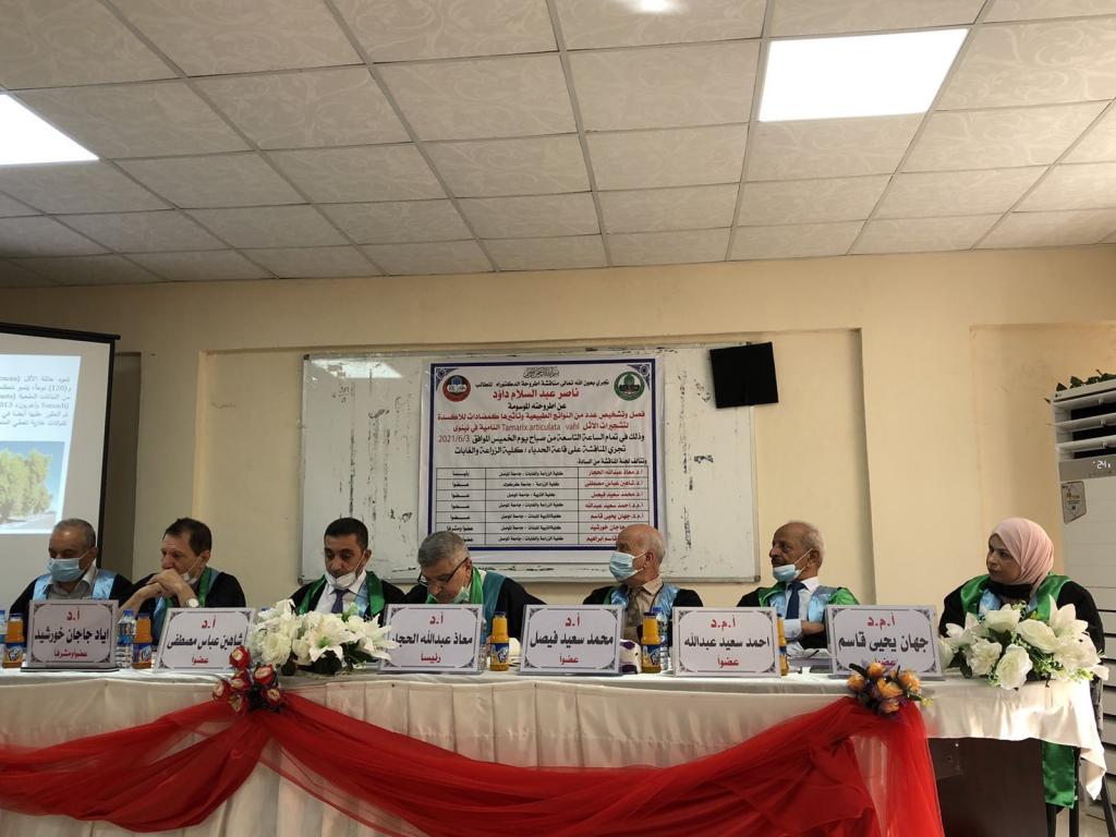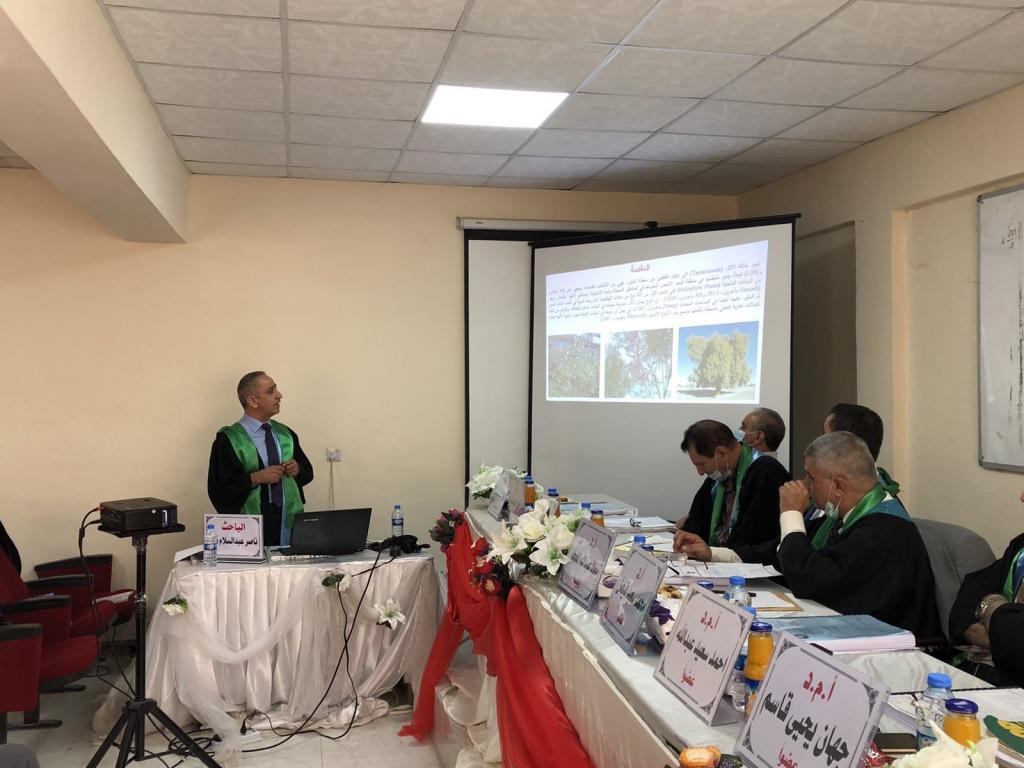 نوقشت صباح اليوم اطروحة دكتوراه في قسم علوم الغابات تقدم بها الطالب ناصر عبد السلام داود والموسومة ( فصل وتشخيص عدد من النواتج الطبيعية وتأثيرها كمضادات للأكسدة لشجيرات الأثل النامية في نينوى) .