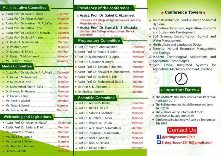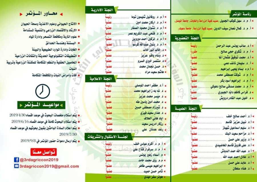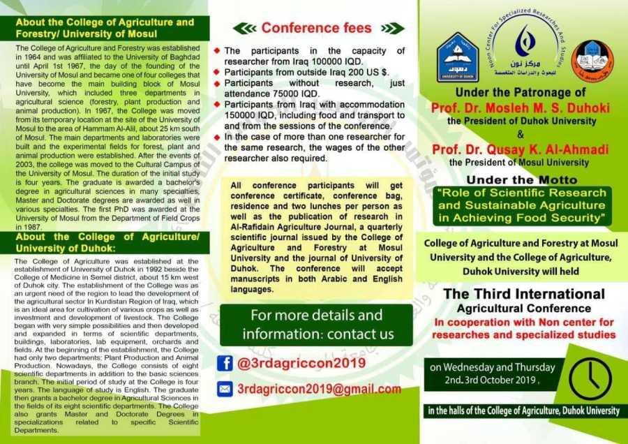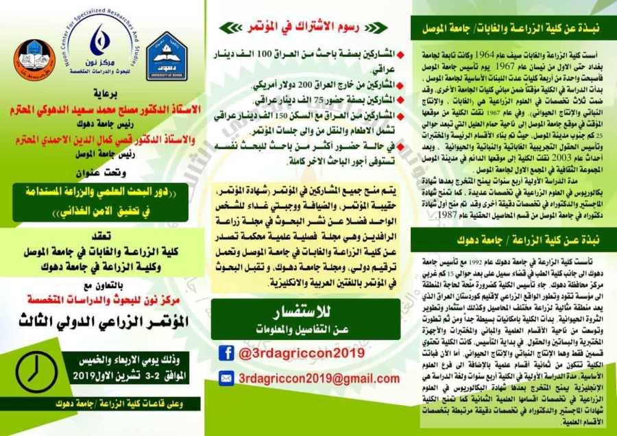 برعاية الاستاذ الدكتور مصلح محمد سعيد الدهوكي رئيس جامعة دهوك والاستاذ الدكتور قصي كمال الدين الاحمدي رئيس جامعة الموصل وتجسيداً للتعاون العلمي بين كلية الزراعة والغابات في جامعه الموصل وكلية الزراعة في جامعة دهوك، يعقد المؤتمر الزراعي الدولي الثالث وذلك بالتعاون مع مركز نُون للبحوث والدراسات المتخصصة تحت عنوان (دور البحث العلمي والزراعة المستدامة في تحقيق الأمن الغذائي) وذلك بتاريخ ٢-٣ /١٠ /٢٠١٩ وعلى قاعات كلية الزراعة في جامعة دهوك نأمل مشاركتكم الواسعة دعماً للبحث العلمي ومساهمةً منكم في تحقيق الأمن الغذائياللجنة التحضيرية للمؤتمر