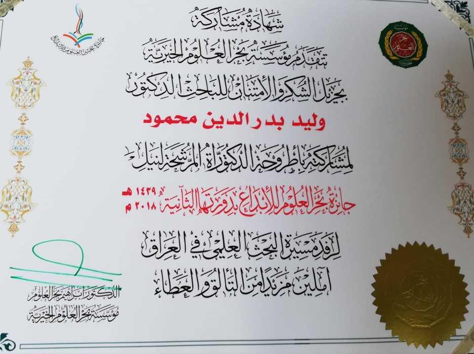 قام السيد عميد الكلية الدكتور سهل كوكب الجميل يرافقه معاونيه للشؤون الادارية والعلمية كل من الدكتور فراس كاظم الجبوري والدكتور بسام يحيى ابراهيم بتسليم جائزة بحر العلوم للإبداع وهي جائزة تطلقها مؤسسة بحر العلوم الخيرية للدكتور وليد بدر الدين الليلة التدريسي في قسم البستنة وهندسة الحدائق لمشاركته بأطروحة الدكتوراه في المسابقة للدورة الثانية .وقدم السيد العميد التهنئة للدكتور الليلة مثمنا له مشاركته القيمة في الجائزة ومتمنيا له دوام التوفيق والنجاح في مسيرته العلمية ، ودعا السيد العميد جميع تدريسي الكلية للمشاركة في هذه المسابقة لما تمثله من دعم للإبداع والمبدعين في كافة مجالات المعرفة في المؤسسات التعليمية.من جانبه قدم السيد رئيس قسم البستنة وهندسة الحدائق الدكتور محمد داؤد الصواف شكره وتقديره للسيد العميد لتسليمه الهدية للدكتور الليلة مثمنا جهوده في متابعة النشاطات العلمية لمنتسبي الكلية .