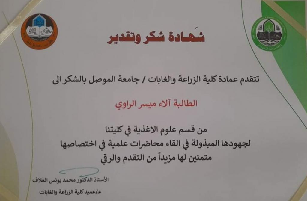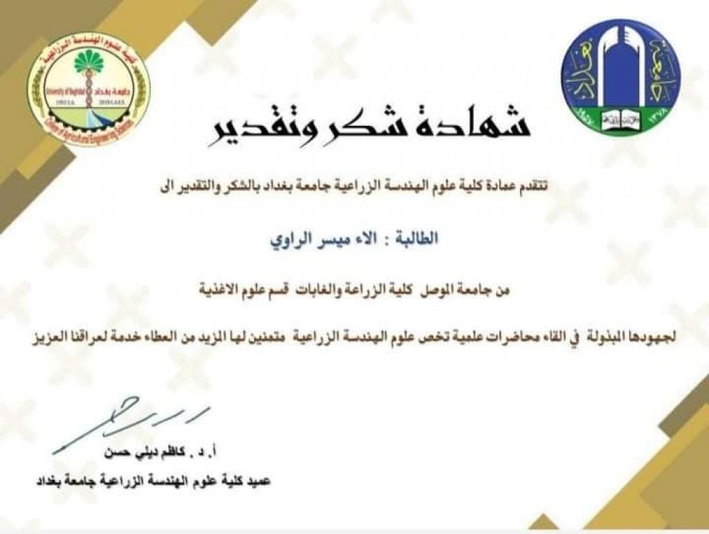ضمن متابعته المستمرة لنشاطات أبناءه الطلبة كرم السيد عميد الكلية الاستاذ الدكتور محمد يونس العلاف الطالبة في المرحلة الثالثة في قسم علوم الاغذية الآء ميسر الرآوي وذلك لجهودها المتميزة من خلال إلقاء محاضرات الكترونية علمية في اختصاصها من خلال منصة الكترونية تم إعدادها من قبل عمادة كلية علوم الهندسة الزراعية في جامعة بغداد