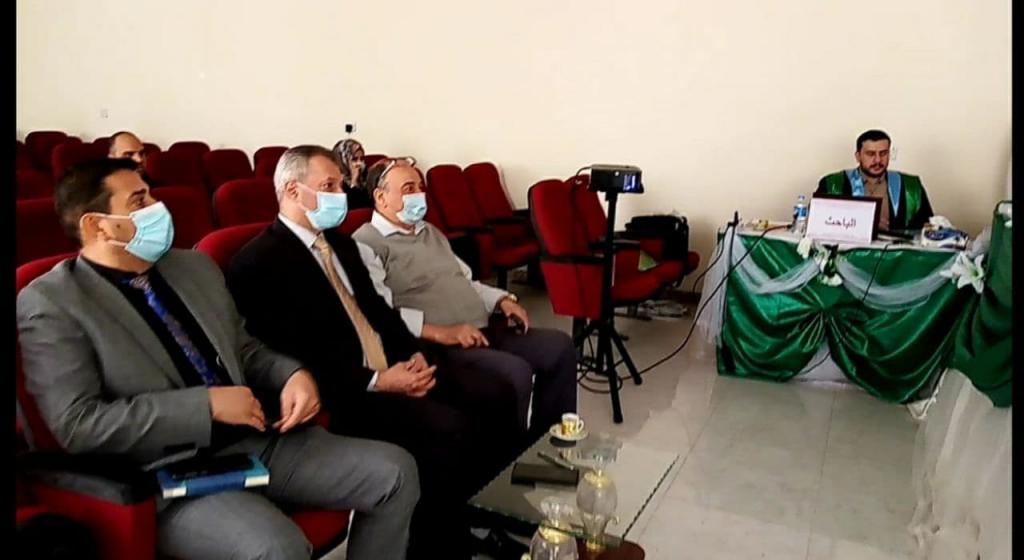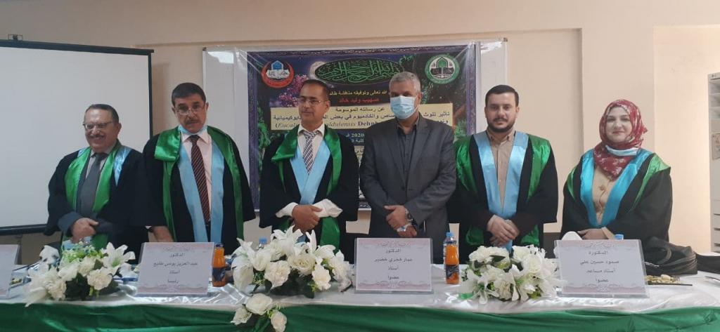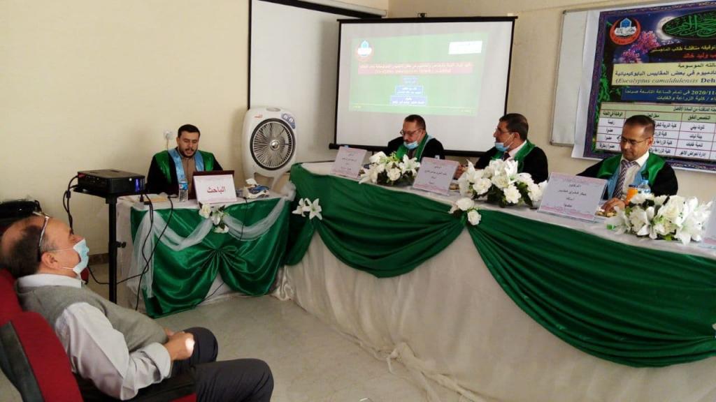 بحضور السيد عميد الكلية المحترم نوقشت صباح اليوم الأربعاء 2020/11/11 وعلى قاعة الحدباء رسالة الماجستير الموسومة ( تأثير تلوث التربة بالرصاص والكادميوم في بعض المقاييس البايوكيمائية ونمو شتلات اليوكالبتوس ( Eucalptus camaldulensis Dehnh) ) للطالب صهيب وليد خالد حيث تألفت لجنة المناقشة من الاستاذ الدكتور عبد العزيز يونس طليع رئيساً والاستاذ الدكتور عمار فخري خضير عضواً والاستاذ المساعد الدكتورة صمود حسين علي عضواً والاستاذ الدكتور ابراهيم انور ابراهيم عضوا ومشرفاوبعد دفاع الطالب عن رسالته تم قبولها بعد اجراء التصحيحات التي اقرتها لجنة المناقشة