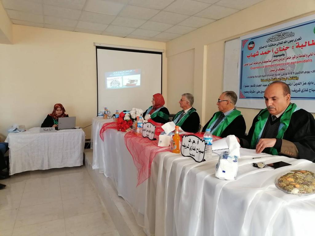 بحضور السيد عميد الكلية الدكتور محمد يونس العلاف ومعاونيه العلمي والاداري نوقشت في قسم الغابات رسالة ماجستير للطالبة حنان احمد شهاب والموسومة ( تأثير الاجهاد المائي والمعاملة بتراكيز حامض البرولين وحامض السالسيليك في مدى مقاومة السرو العمودي للجفاف في نينوى ) ، وقد تالفت لجنة المناقشة من السادة