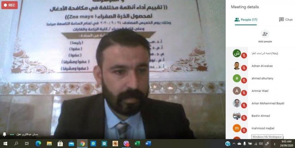 بحضور السيد عميد الكلية الدكتور محمد يونس العلاف ومعاونه العلمي نوقشت في كليتنا وعبر منصة(Google meet) رسالة ماجستير في قسم المكائن والالات الزراعية للطالب (حسان عبد الكريم عقيل) لرسالته الموسومة (تقييم اداء انظمة مختلفة في مكافحة ادغال محصول الذرة الصفراء) وقد تألفت لجنة المناقشة من السادة :