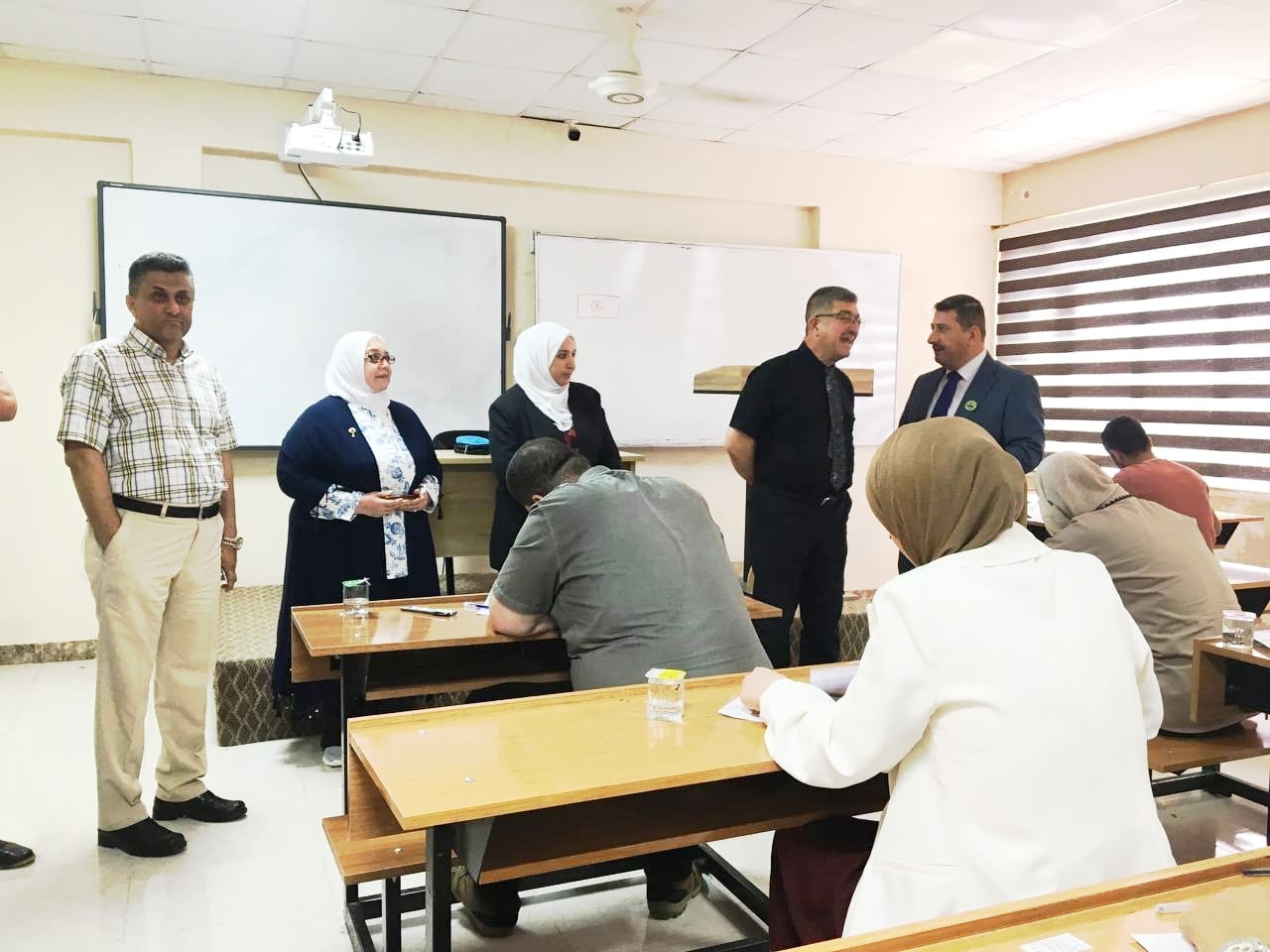 الاستاذ الدكتور علي فاروق المعاضيدي برفقة رئيس اللجنة الامتحانية الاستاذ الدكتورة جهينة ادريس القاعات الامتحانية واطلع على سير العملية الامتحانية ومدى مراعاة الأسئلة الامتحانية لمستويات الطلبة والوقت المحدد لها ومدى شموليتها مؤكداً على توفير جميع الظروف الملائمة للطلبة لتحقيق التفوق والنجاح.