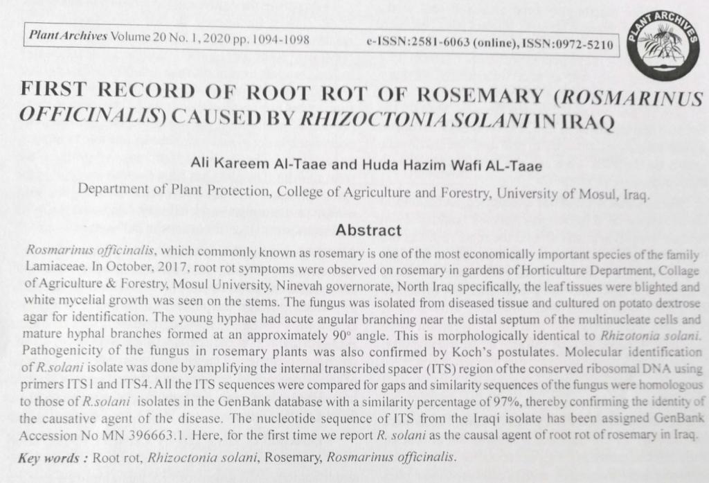 ضمن النشاطات العلمية لتدريسي كليتنا تم نشر بحث علمي للأستاذ الدكتور علي كريم الطائي والدكتورة هدى حازم وافي الطائي التدريسيان في قسم وقاية النبات في مجلة علمية ضمن مستوعبات سكوبس وتم في البحث تسجيل الفطر رايزكتونيا سولاني مسبب مرض تعفن جذور نبات اكليل الجبل لأول مرة في العراق وتم من خلاله تسجيل جينات عزلات الفطر في بنك المعلومات الدولي NCBI وهو إنجاز جديد يضاف إلى النشاطات العلمية لكليتنا في مجال البحث العلمي