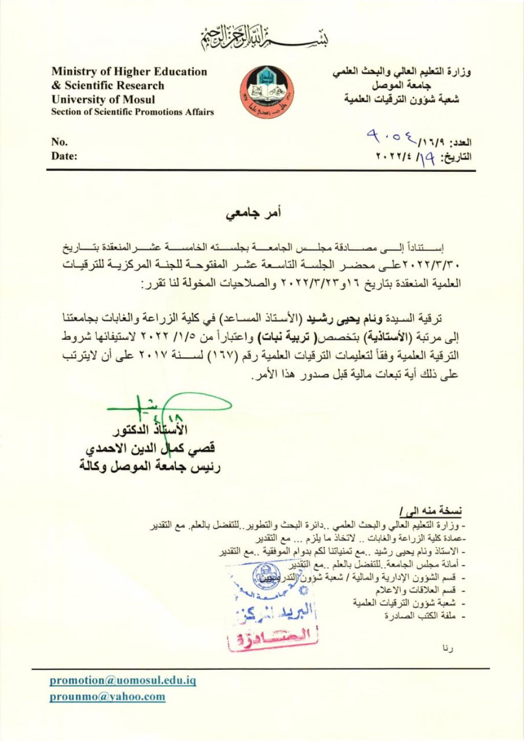 تتقدم عمادة كلية الزراعة والغابات متمثلة بالسيد العميد الاستاذ الدكتور محمد يونس العلاف وبالنيابة عن جميع منتسبي كليتنا بأسمى آيات التهنئة والتبريكات للسيدة وئام يحيى رشيد التدريسية في قسم المحاصيل الحقلية في كليتنا بمناسبة ترقيتها العلمية لمرتبة الأستاذية متمنين لها دوام التوفيق والنجاح من أجل تعزيز مسيرة العلم وخدمة بلدنا الغالي وجامعتنا الحبيبة.