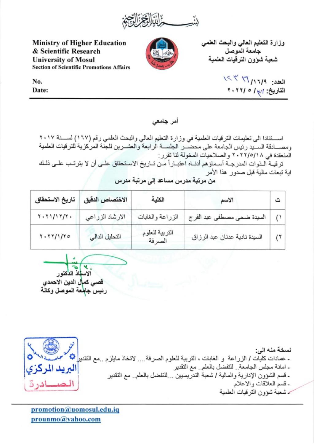 تتقدم عمادة كلية الزراعة والغابات متمثلة بالسيد العميد الاستاذ الدكتور محمد يونس العلاف وبالنيابة عن جميع منتسبي كليتنا بأسمى آيات التهنئة والتبريكات للسيدة ضحى مصطفى عبد الفرج التدريسية في قسم الارشاد الزراعي في كليتنا بمناسبة ترقيتها العلمية لمرتبة (مدرس) متمنين لها دوام التوفيق والنجاح من أجل تعزيز مسيرة العلم وخدمة بلدنا الغالي وجامعتنا الحبيبة.شعبة الإعلام والعلاقات العامة