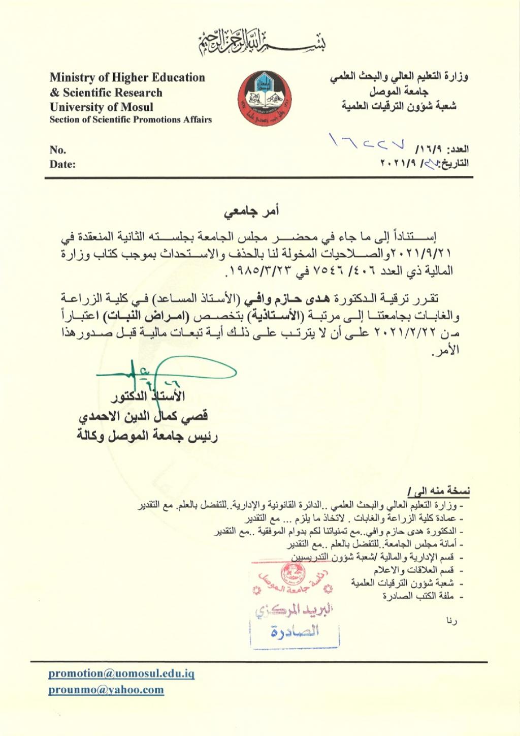تتقدم عمادة كلية الزراعة والغابات متمثلة بالسيد العميد الاستاذ الدكتور محمد يونس العلاف وبالنيابة عن جميع منتسبي كليتنا بأسمى آيات التهنئة والتبريكات للدكتورة هدى حازم وافي التدريسية في قسم وقاية النبات في كليتنا بمناسبة ترقيتها العلمية لمرتبة الاستاذية متمنين لها دوام التوفيق والنجاح من أجل تعزيز مسيرة العلم وخدمة بلدنا الغالي وجامعتنا الحبيبة.
