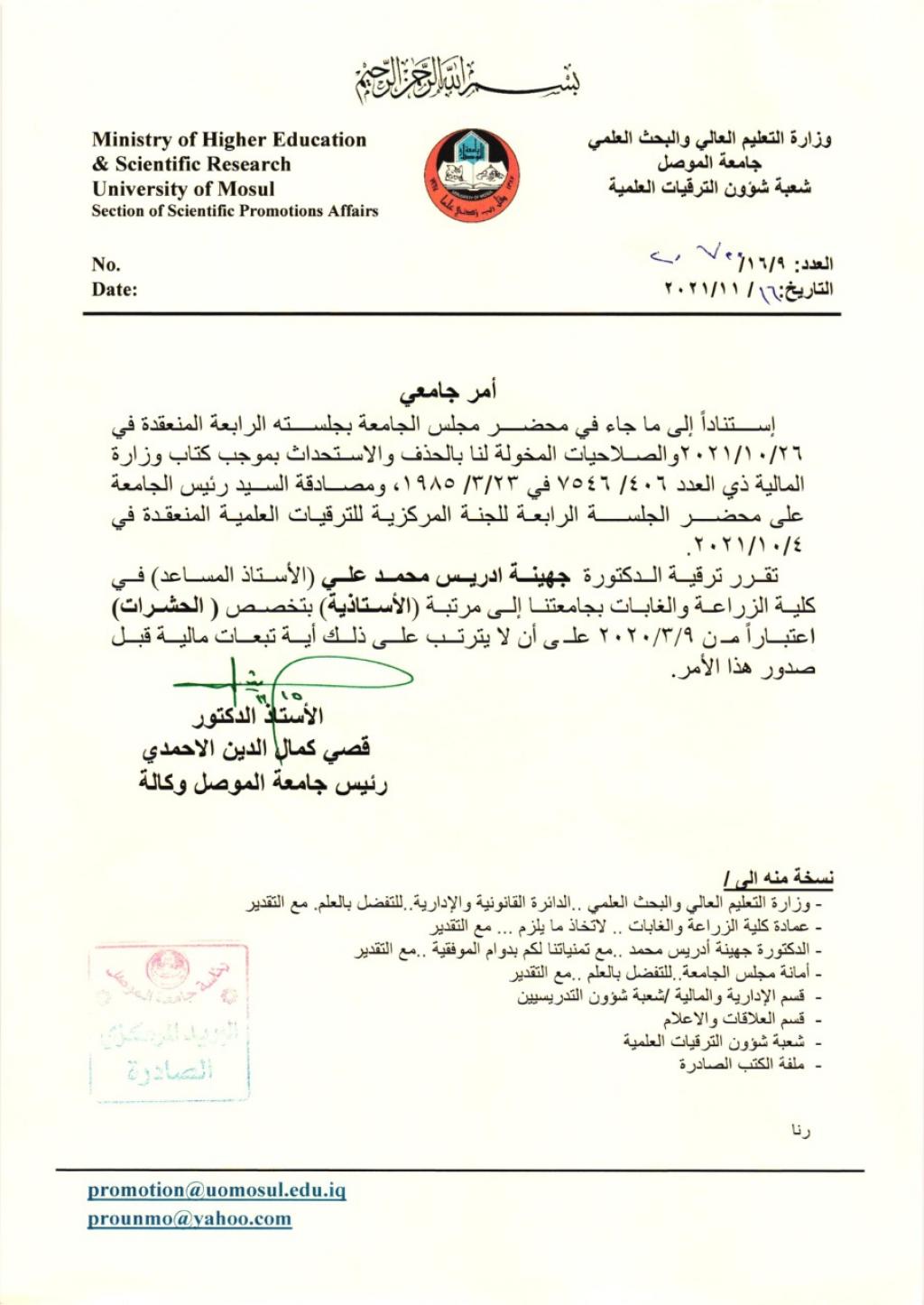 تتقدم عمادة كلية الزراعة والغابات متمثلة بالسيد العميد الاستاذ الدكتور محمد يونس العلاف وبالنيابة عن جميع منتسبي كليتنا بأسمى آيات التهنئة والتبريكات للدكتورة جهينه إدريس محمد رئيس قسم وقاية النبات في كليتنا بمناسبة ترقيتها العلمية لمرتبة الاستاذية متمنين لها دوام التوفيق والنجاح من أجل تعزيز مسيرة العلم وخدمة بلدنا الغالي وجامعتنا الحبيبة.