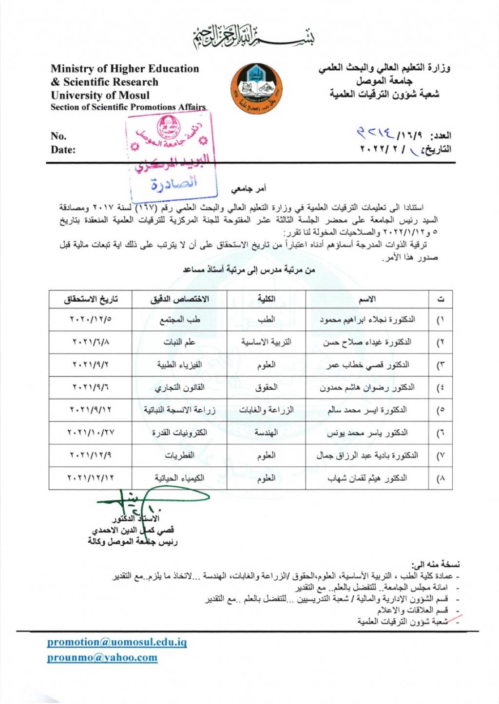 تتقدم عمادة كلية الزراعة والغابات متمثلة بالسيد العميد الاستاذ الدكتور محمد يونس العلاف وبالنيابة عن جميع منتسبي كليتنا بأسمى آيات التهنئة والتبريكات للدكتورة أيسر محمد سالم التدريسية في قسم البستنة وهندسة الحدائق في كليتنا بمناسبة ترقيتها العلمية لمرتبة استاذ مساعد متمنين لها دوام التوفيق والنجاح من أجل تعزيز مسيرة العلم وخدمة بلدنا الغالي وجامعتنا الحبيبة.