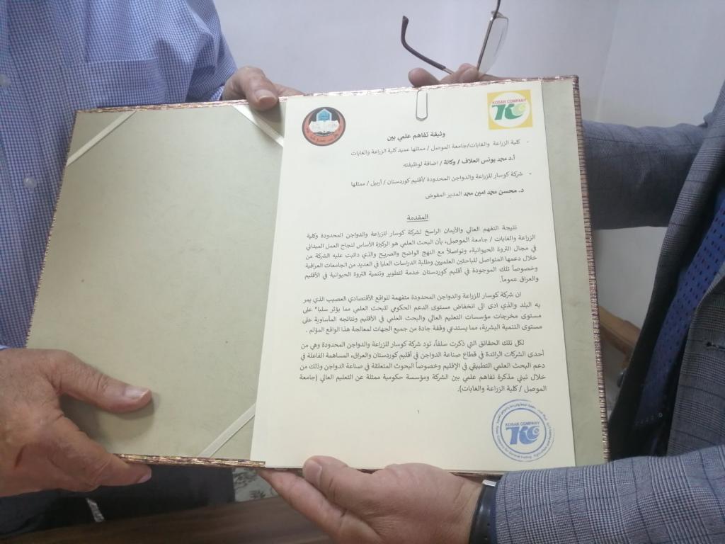 تعزيزا للتعاون العلمي وتبادل الخبرات في مجال الإنتاج الزراعي والحيواني بشكل خاص فقد وقعت عمادة كليتنا مذكرة تفاهم علمي مع شركة كوسار للزراعة والدواجن المحدودة وهي إحدى الشركات الرائدة في مجال قطاع صناعة الدواجن ، وقد وقع المذكرة عن كليتنا الاستاذ الدكتور محمد يونس العلاف عميد الكلية فيما وقعت من قبل الدكتور محسن محمد امين المدير المفوض لشركة كوسار.