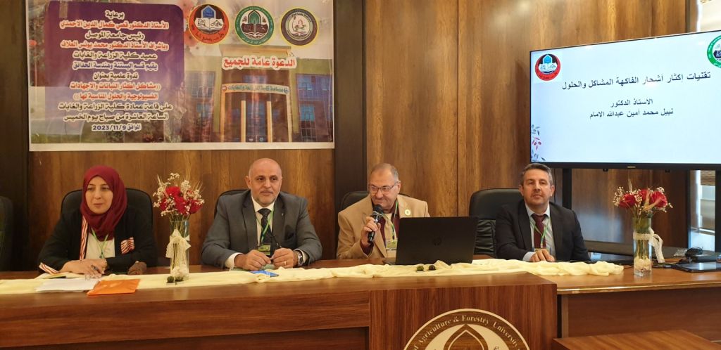 التي أقامها قسم البستنة وهندسة الحدائق في كليتنا الخميس الموافق ٩ / ١١ / ٢٠٢٣ والموسومة ((مشاكل اكثار النباتات والاجهادات الفسيولوجية والحلول المناسبة لها )) على قاعة عمادة كلية الزراعة والغابات والتي أقيمت برعاية الأستاذ الدكتور قصي كمال الدين الاحمدي المحترم رئيس الجامعة وبإشراف السيد عميد الكلية الاستاذ الدكتور محمد يونس العلاف المحترم وحضرها السيد مساعد رئيس الجامعة للشؤون العلمية الاستاذ الدكتور منير البدراني ومعاوني العميد للشؤون العلمية والادارية وعدد من ممثلي كليات الزراعة والدوائر الزراعية والخدمية في المحافظة فضلا عن تدريسي وطلبة كليتنا .