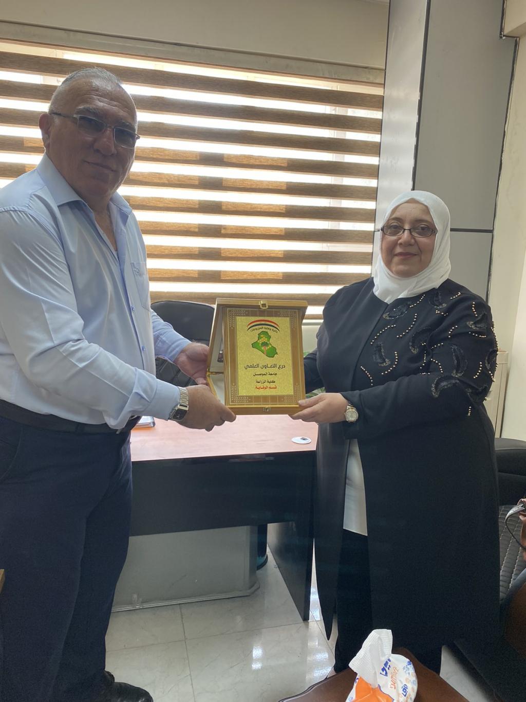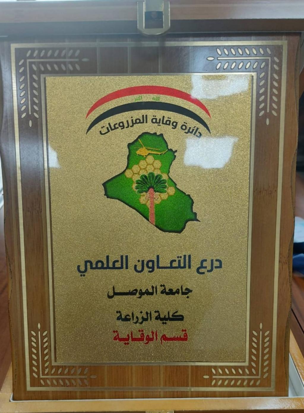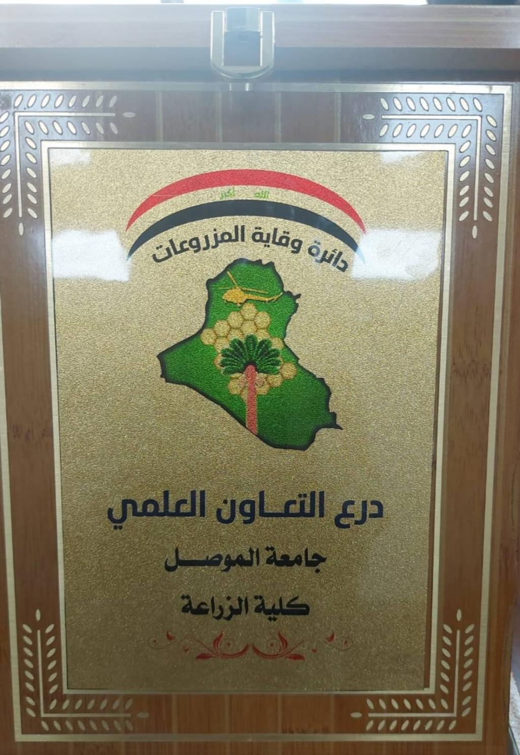 ضمن ورشة العمل العلمية التي أقيمت برعاية معالي وزير الزراعة وباشراف دائرة وقاية النبات في وزارة الزراعة بعنوان (مكافحة الآفات الزراعية حاضرها ومستقبلها) تم تكريم السيد عميد الكلية الاستاذ الدكتور محمد يونس العلاف ورئيس قسم وقاية النبات الاستاذ الدكتورة جهينة ادريس بدروع تكريمية من قبل السيد مدير عام دائرة الوقاية وتم تكليف الدكتور صلاح الدين عبدالقادر مدير قسم الوقاية في مديرية زراعة نينوى بتسليم الدروع .