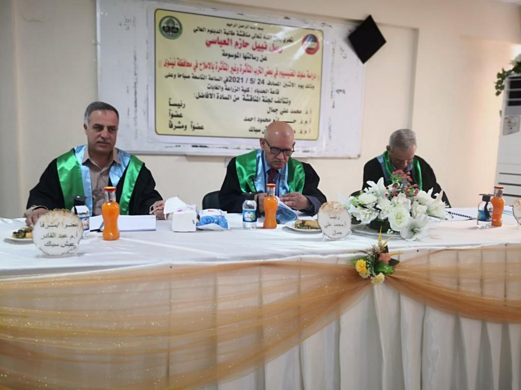 نوقشت في قسم علوم التربة والموارد المائية رسالة دبلوم العالي تقدمت بها الطالبة رسل نبيل حازم العباسي والموسومة (دراسة سلوك المغنيسيوم في بعض الترب المتأثرة وغير المتأثرة بالاملاح في محافظة نينوى) حضر جانب منها السيد عميد الكلية ومعاونيه للشؤون العلمية والادارية.