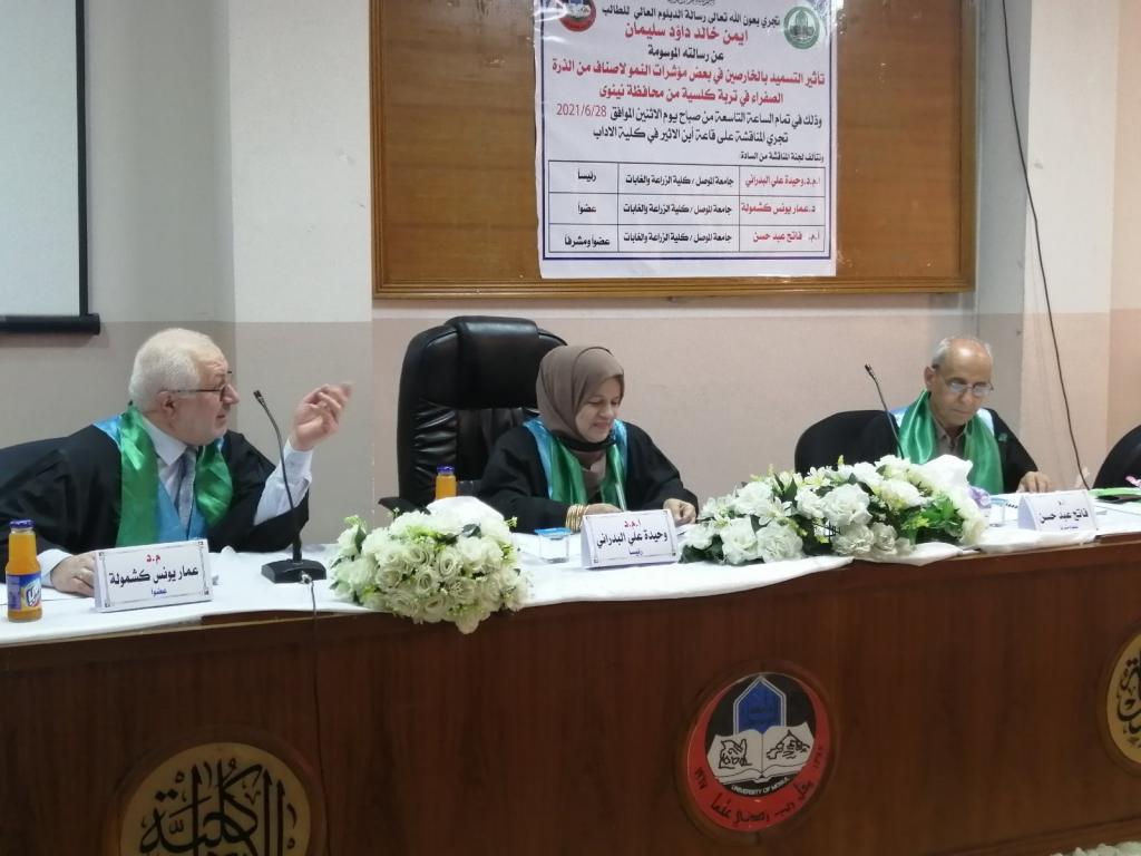 هذا وترأس لجنة المناقشة الدكتورة وحيدة علي احمد البدراني وعضوية الدكتور عمار يونس كشمولة وبأشراف الاستاذ المساعد السيد فاتح عبد حسن