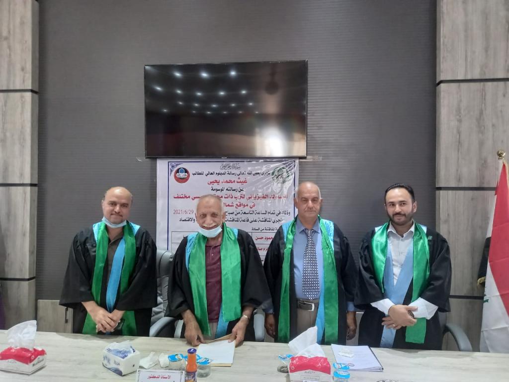 نوقشت صباح اليوم الثلاثاء 2021/6/29 رسالة دبلوم عالي في قسم علوم التربة والموارد المائية تقدم بها الطالب غيث محمد يحيى الموسومة (السلوك الفيزيائي لترب ذات محتوى جبسي مختلف في مواقع شمالي العراق ) حضر جانب منها السيد عميد الكلية ومعاونيه للشؤون العلمية والادارية. وقد ترأس لجنة المناقشة الاستاذ الدكتور هشام محمود حسن وعضوية الدكتور فارس اكرم الوزان وبأشراف الأستاذ المساعد معتصم داؤد سليمان